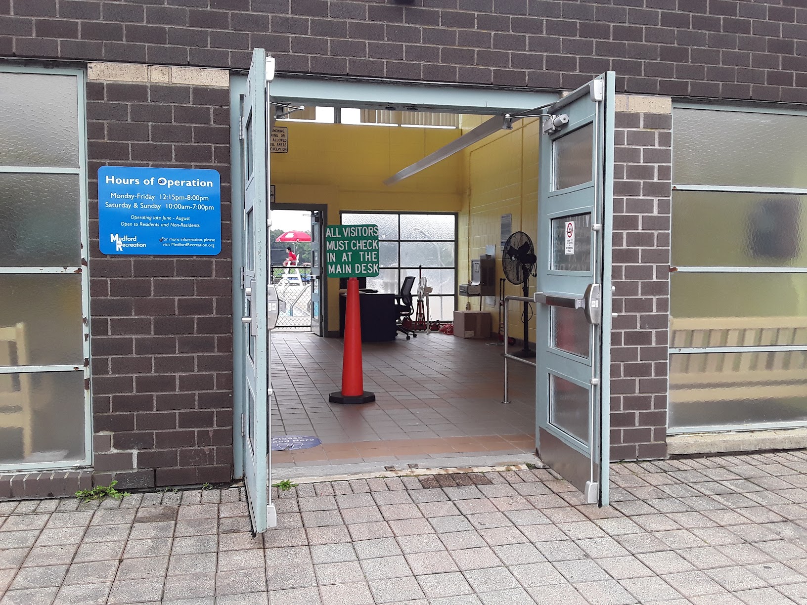 Friendly staff, well maintained L-shaped pool with 3 picnic tables for people to sit. They have classes for kids and for adults who want to elanr to swim but are scared to. 3 areas of the pool: 4' shallow, 6' intermediate, 12' deep area. There is a secondary smaller 3' deep pool next to it. Good summer seasonal hours. No lockers or hairdryers, but basic showers. Pool is next to the park. Registration is at medfordrec.com