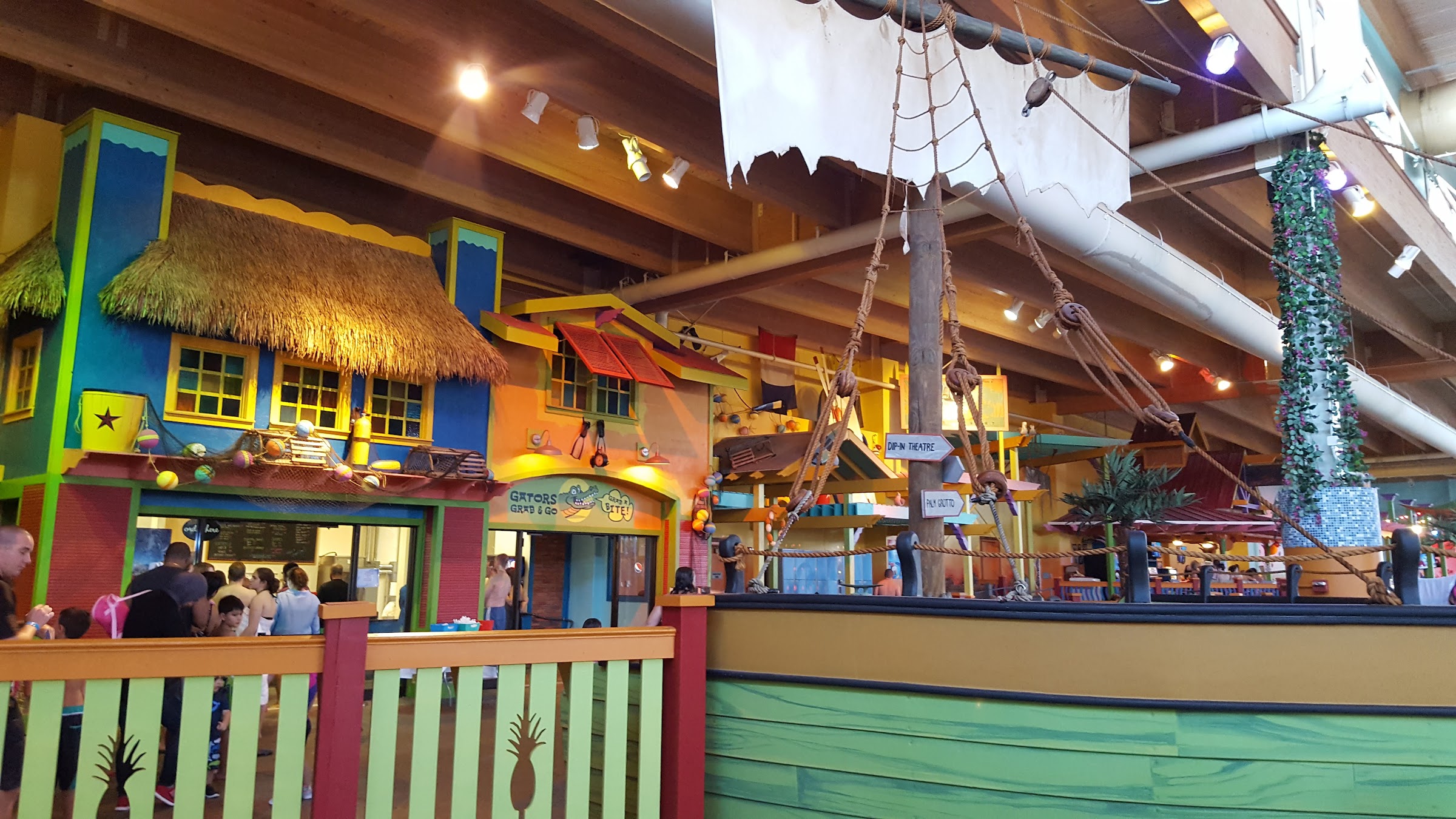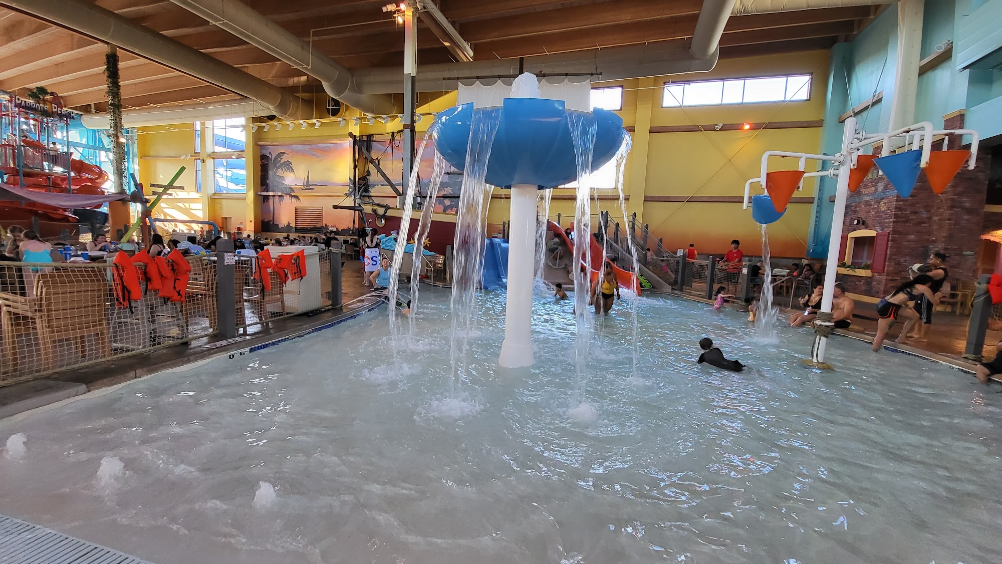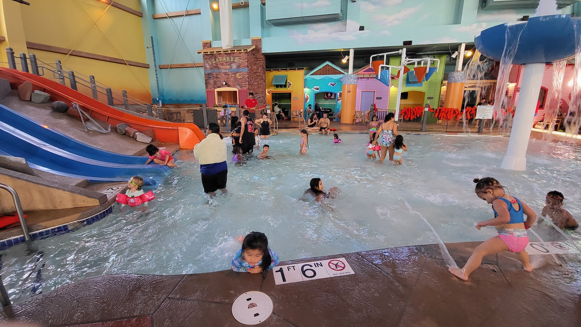 Great place to take your kids. Went for my Godsons birthday. It wasn't crowded when we went. They do have lockers for rent in and out side of the park area. The hot tub is a wonderful concept. Goes from one hot tube on the inside to 3 more connected hot tubs on the outside. No one under 15 is allowed in the hot tub. The only thing is that there were alot of hornets by the splash pad and outside hot tub gate. My Godson ended up getting stung. They do have a first aid office where they were very nice and professional. The place didn't have that overwhelming chlorine smell, but the water did burn my eyes. The lazy river is relaxing but needs more tubes. Many were deflated and a long line of people were waiting for a good tube. The splash pad was cute. I think the grown-ups had more fun on it though. They do have a bar to get a few drinks. You can not drink in the park area. You have to drink in the bar area. It was set up with many tables and chairs. The bartender was nice. The pool was the only place that was crowded. The food and drinks a overpriced but that is to be expected. The kids had a blast. Next time we will stay overnight at the hotel, so we don't have to drive an hour and a half back home after a long day at the park.
