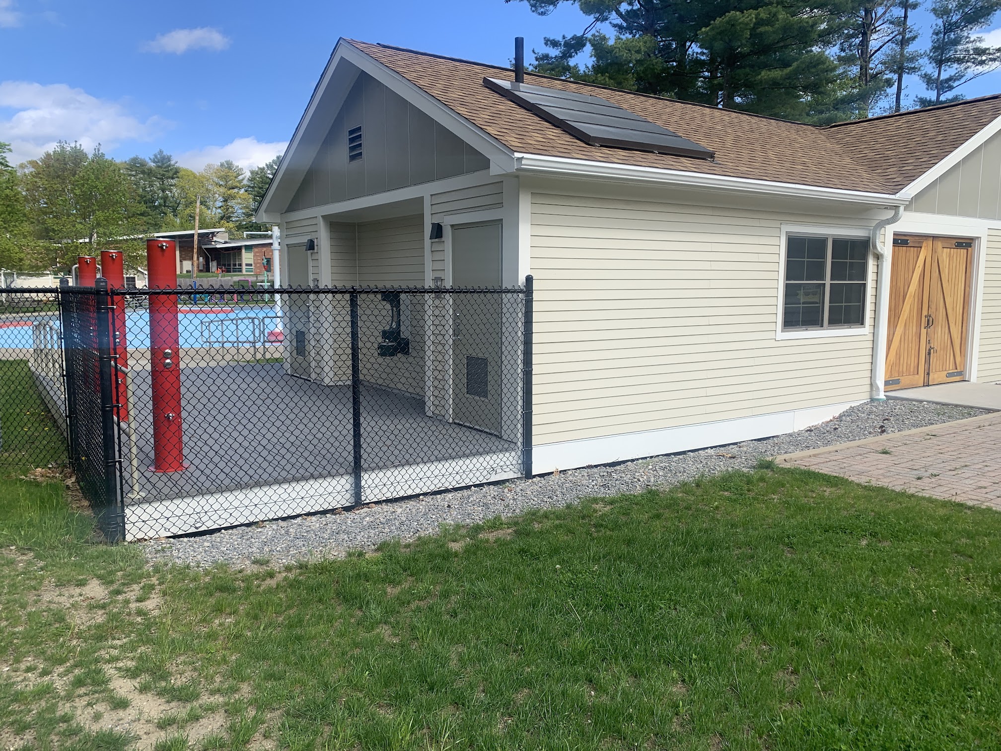 Huge pool, water slide, diving board, splash pad, snack bar, water features in pool. Big shallow end for little kids too and a sand box playground