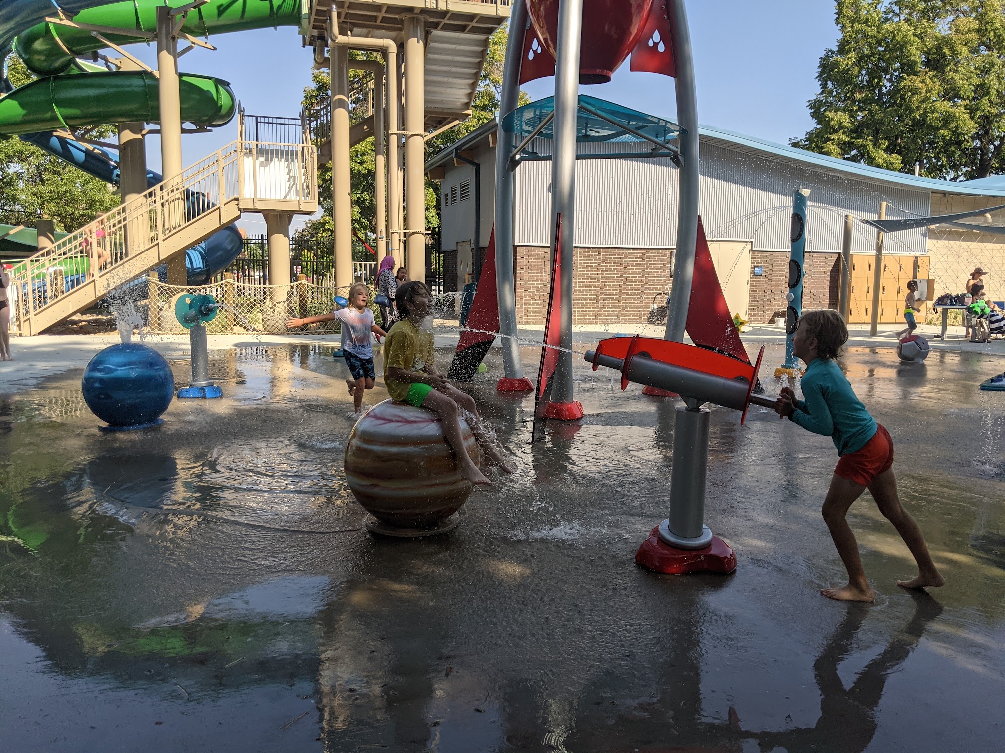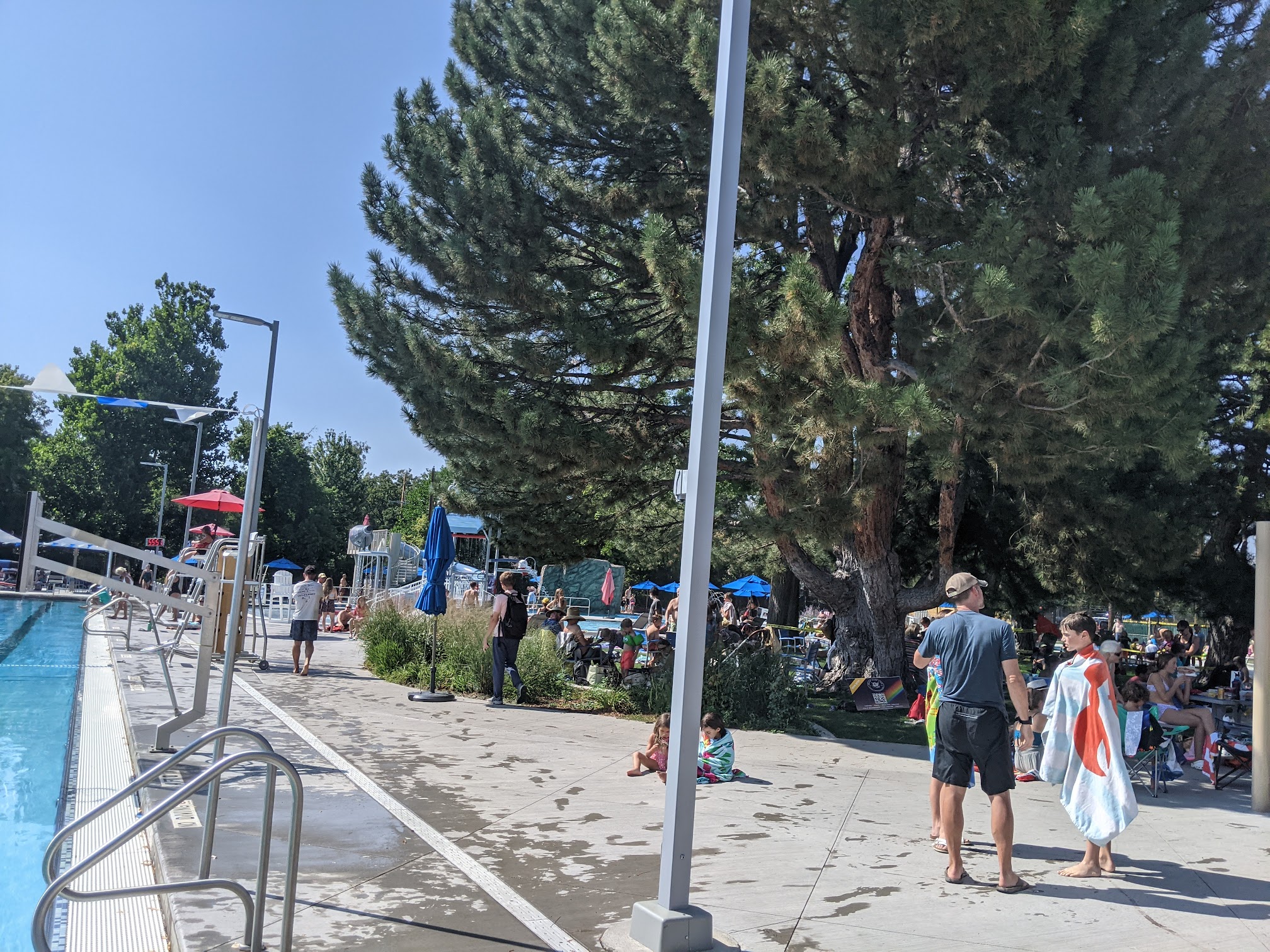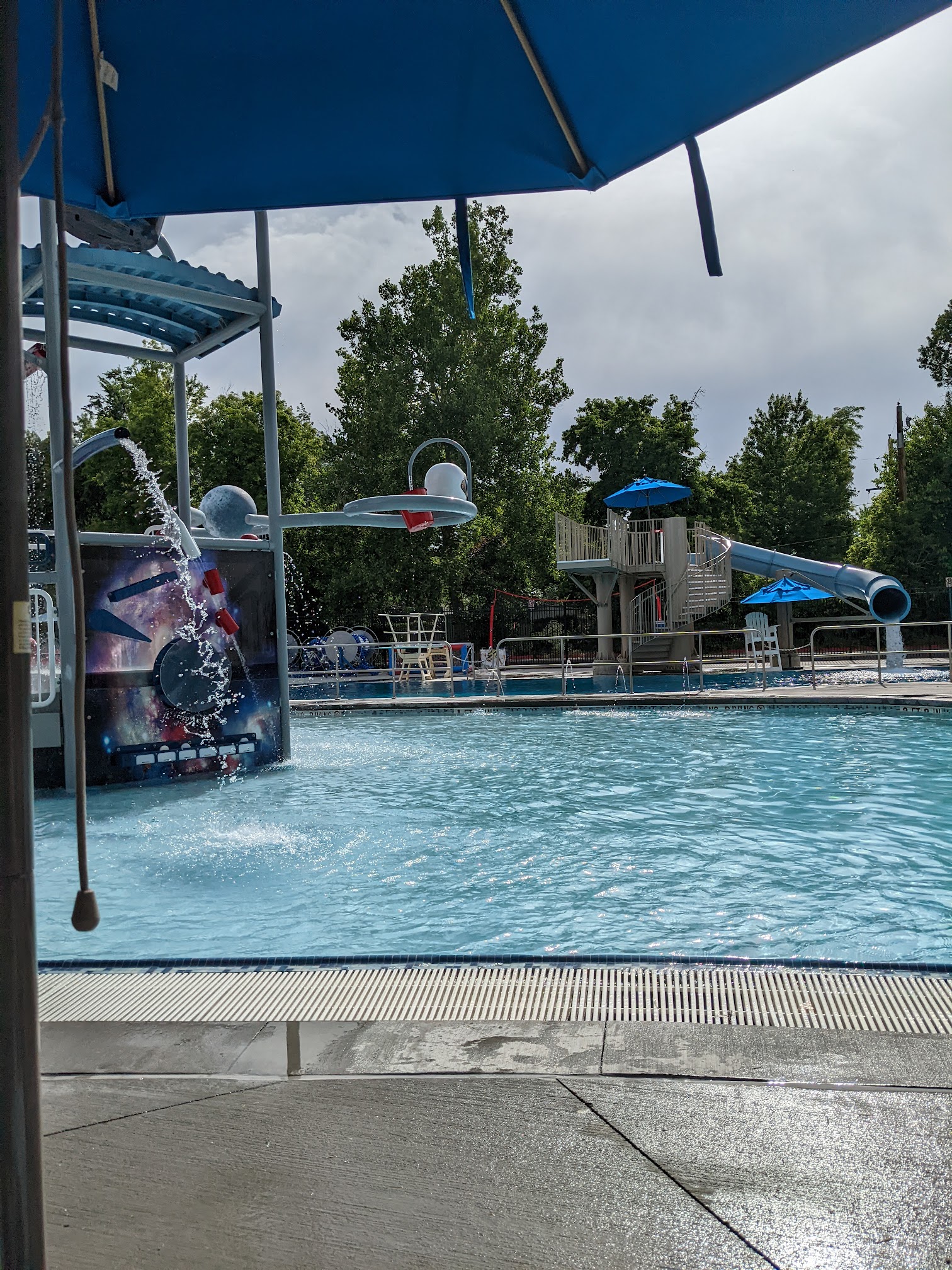 Our favorites were the lazy river, but they also have a diving board, a diving platform, a slide, and a shallow play area for little kids. There is a main pool that is open when the swim team isn’t there. There are shady areas on the grass too!