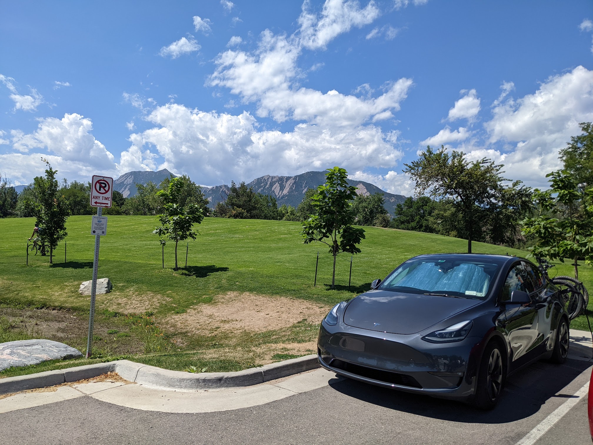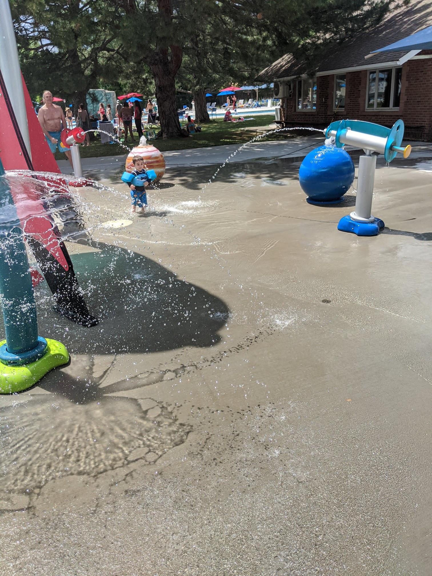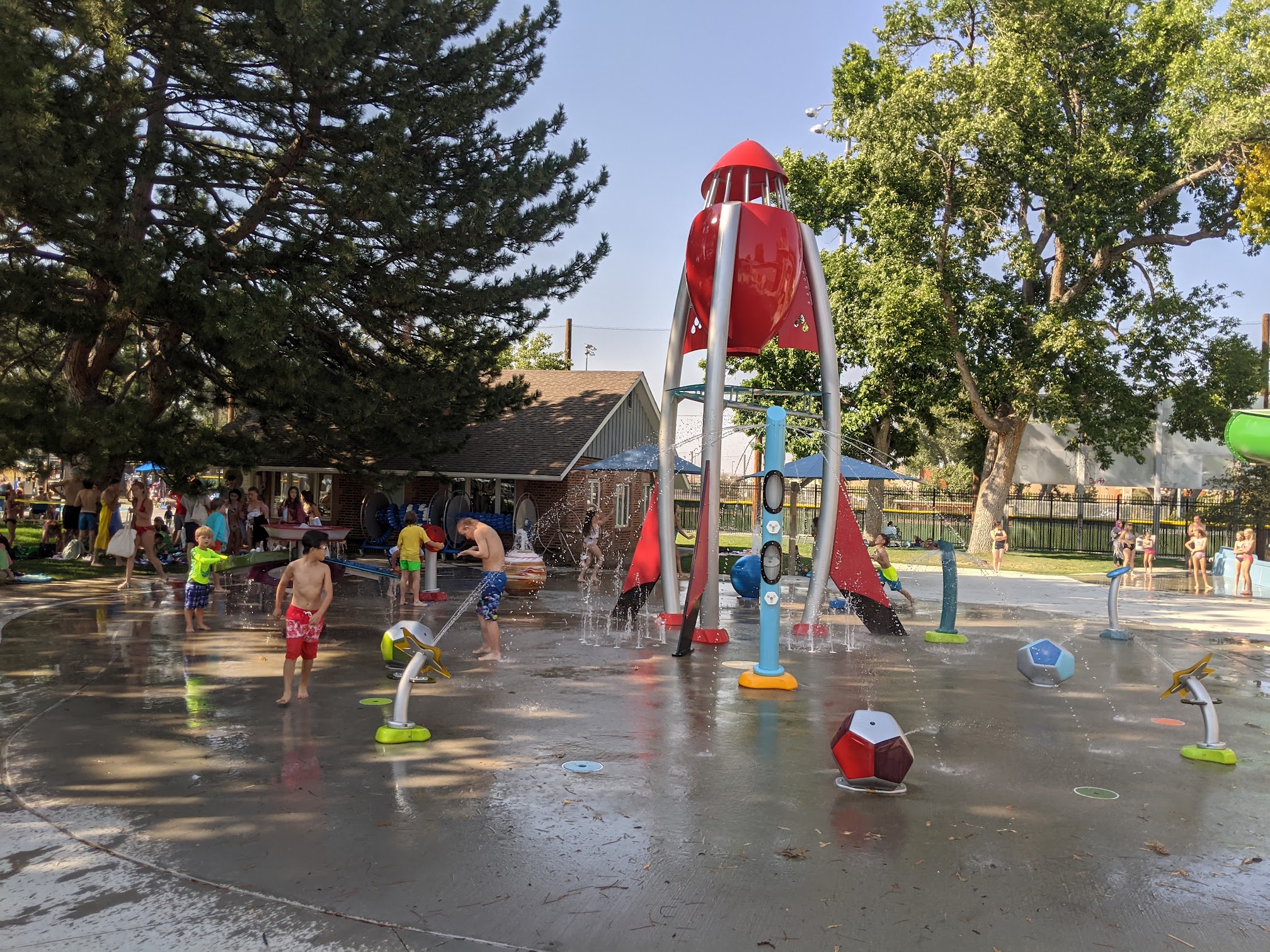 Our favorites were the lazy river, but they also have a diving board, a diving platform, a slide, and a shallow play area for little kids. There is a main pool that is open when the swim team isn’t there. There are shady areas on the grass too!