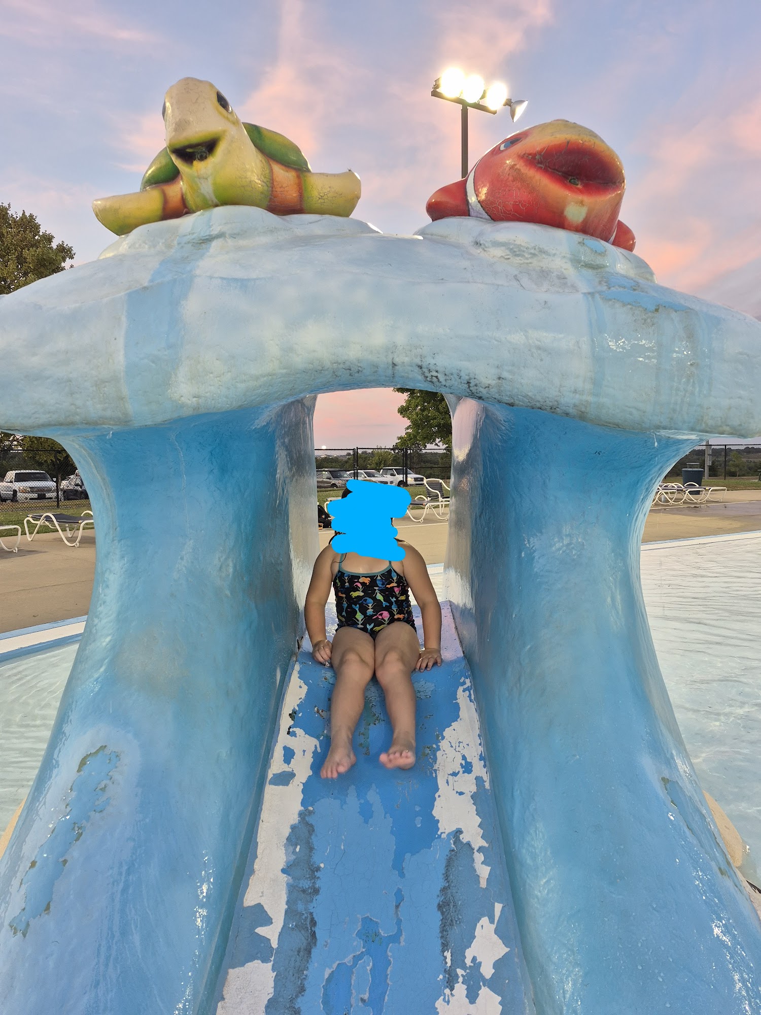 They should have a slide under 48" can do. 42-47" kids get bored easily. Baby slide needs updated badly. Its peeling and so faded. They havent replaced the animal buoys kids can float on. The water is always freezing. Like freezing to where babies and toddlers will have purple lips sometimes. Bathrooms need to be regularly checked because they're not very clean during the day. Picture of kiddie slide for reference.