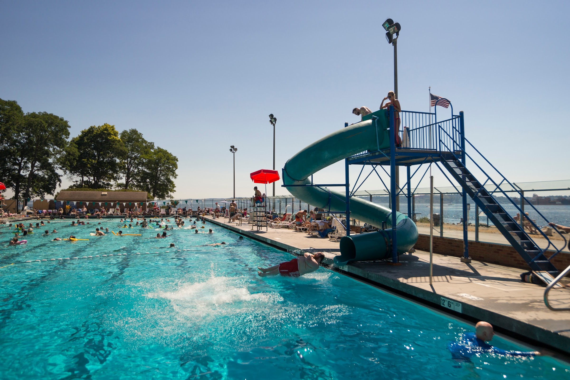 Outdoor salt-water pool featuring laps, a slide, and diving boards, plus views of Puget Sound.