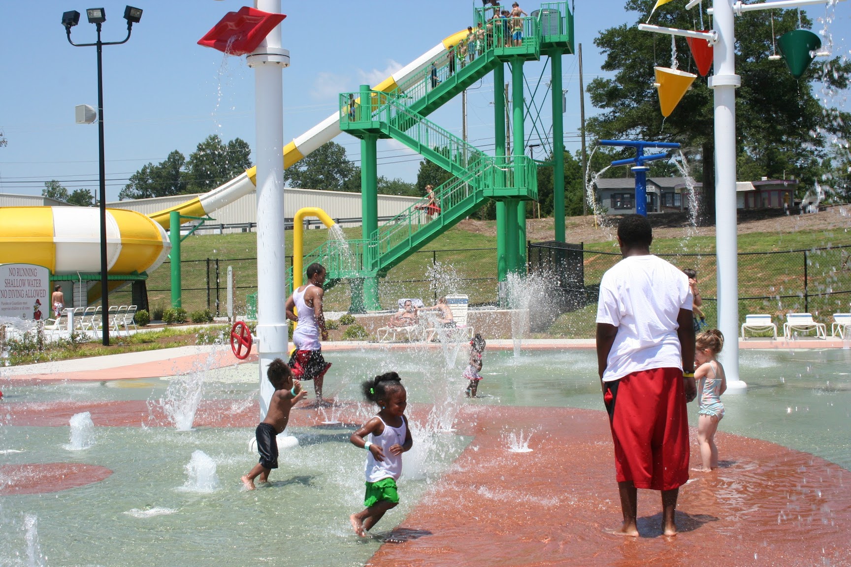 I love this water park.. has i big slide and 2 small slide. Kids must pass swim test for kids safety. I take my school there in the summer. I love all the lifeguards on staff concessions is nice and not very expensive. The splash pad is also a great area for smaller children and bigger children.