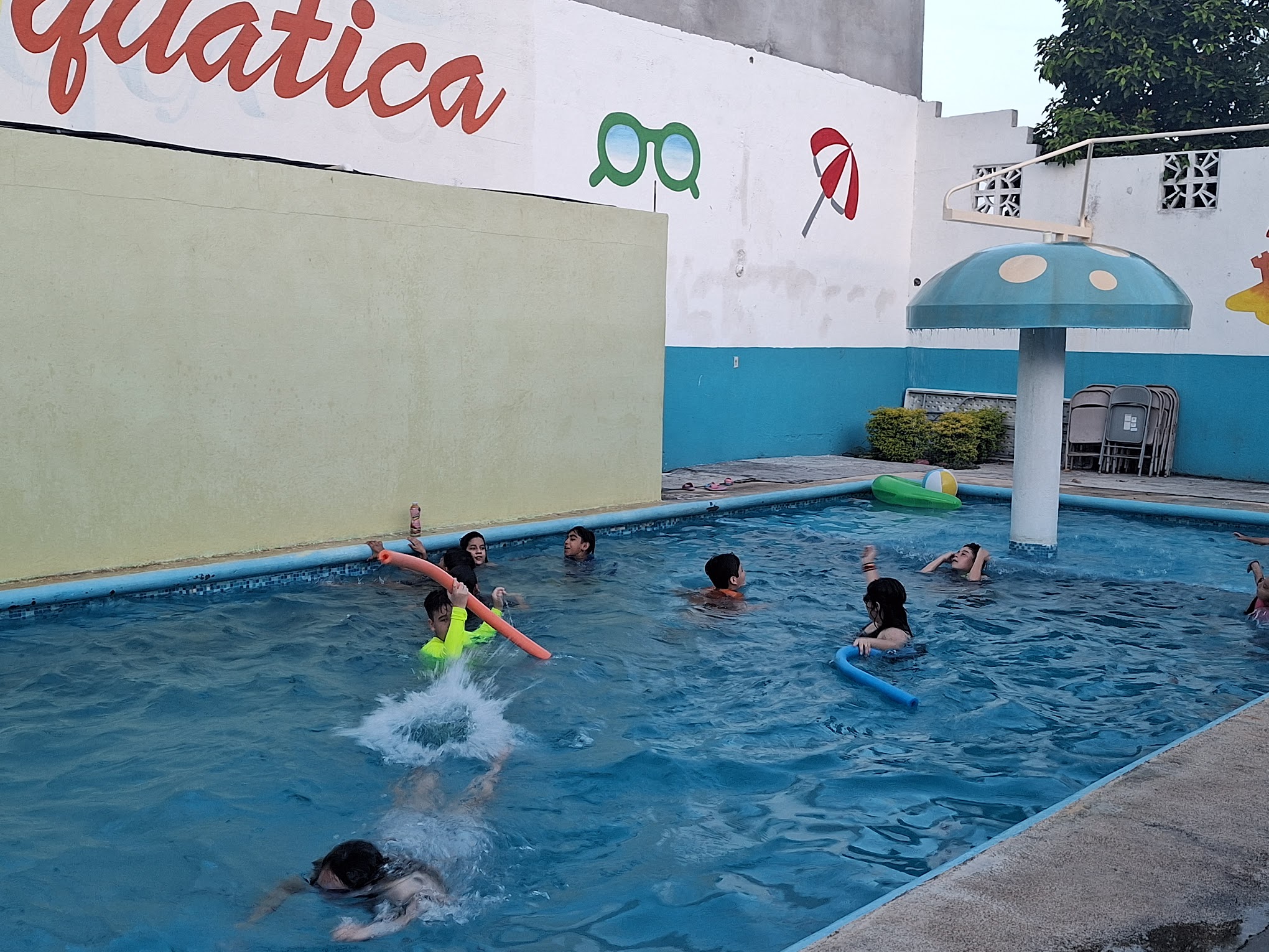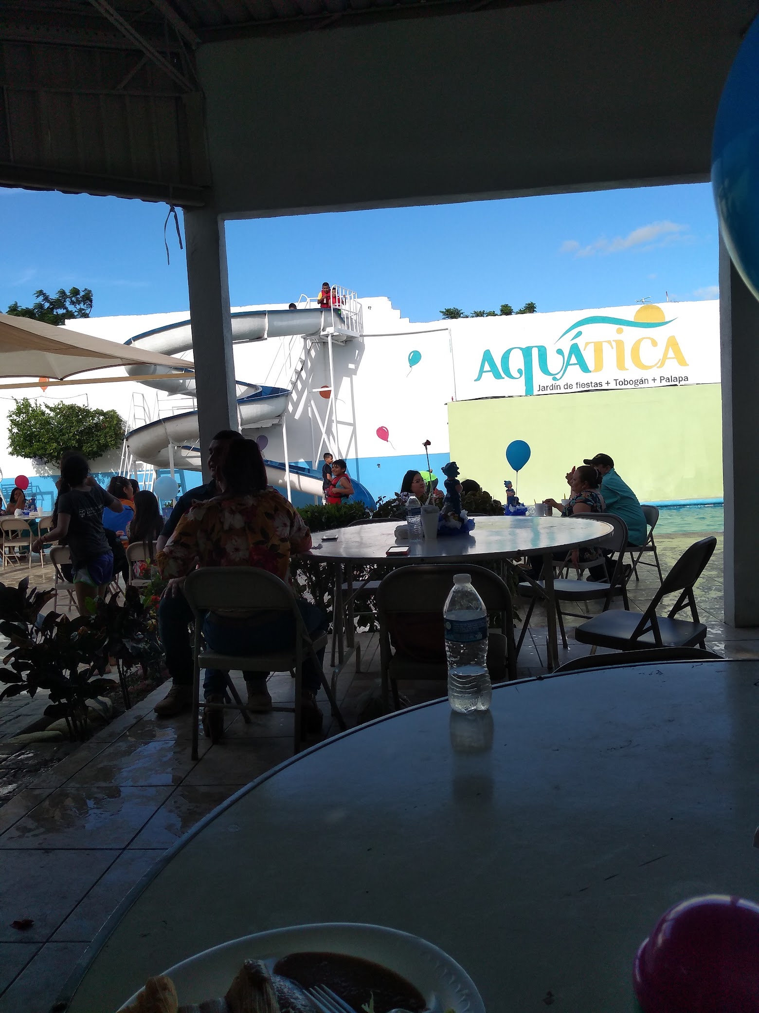 El lugar está bien No me parecio feo pero tampoco vistoso. Podrían agregar regaderas y vestidores, en especial al ser una alberca. Y darle un poco más de potencia (agua) al tobogán, incluso siendo delgados, nos atorabamos.