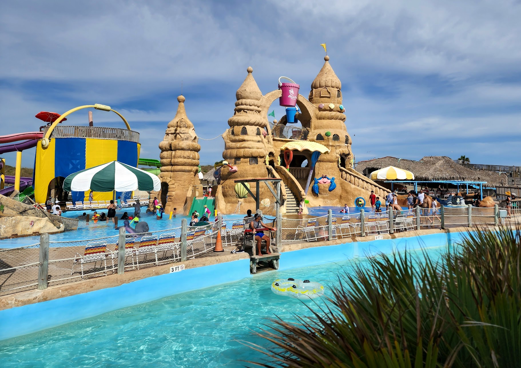 Kid-friendly park featuring over a dozen attractions, including a lazy river, slides, wave pool, rides, and swim-up bars.