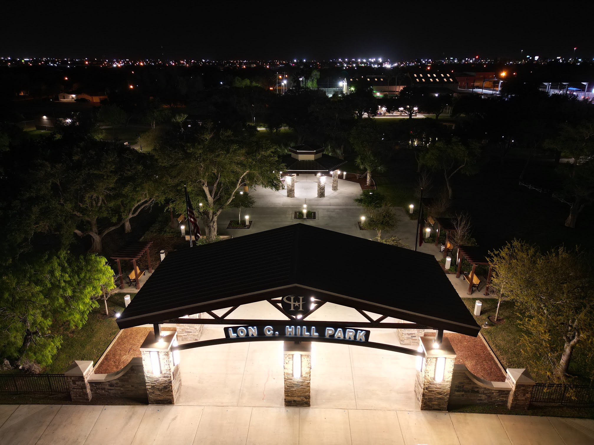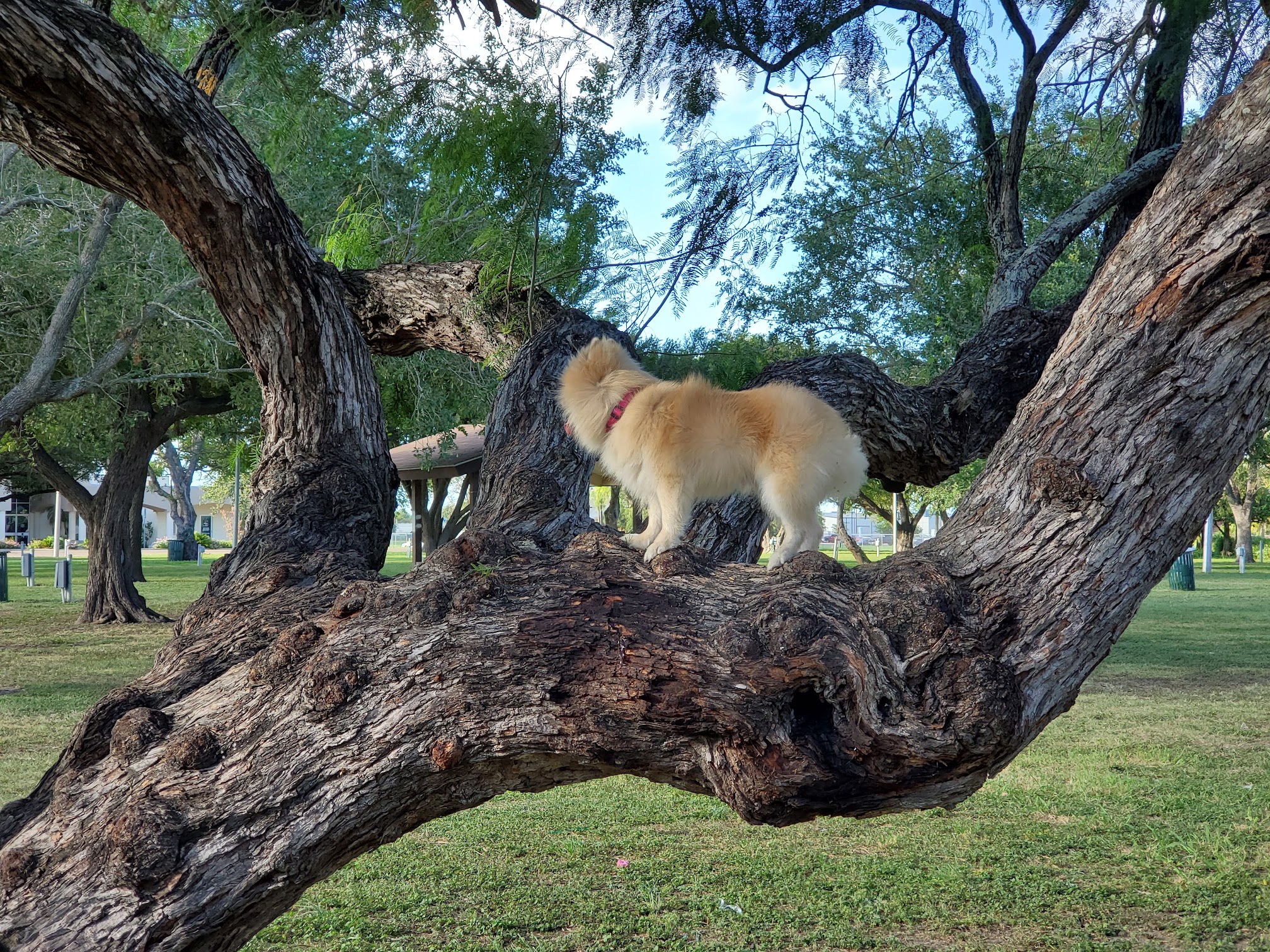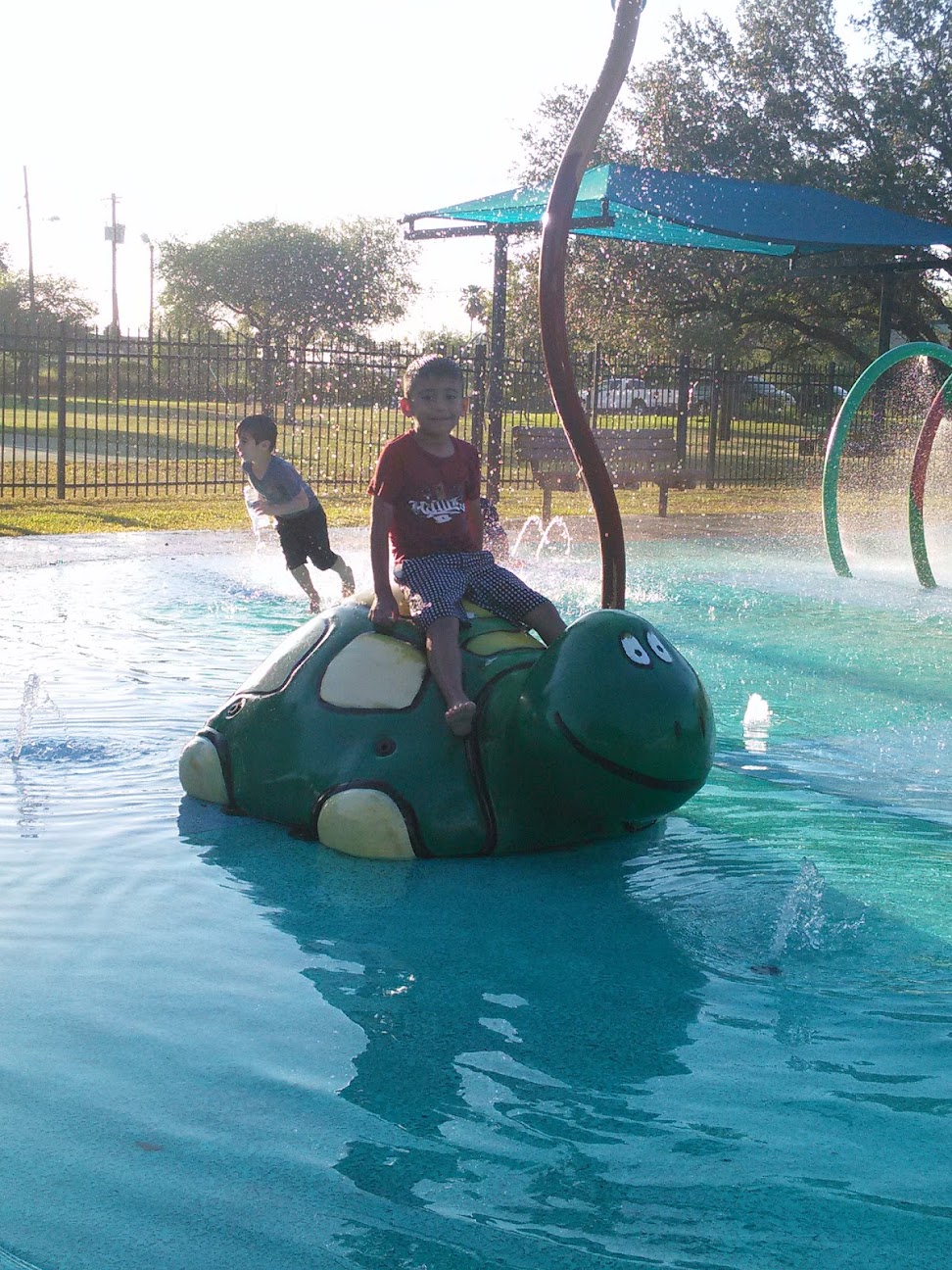 Relaxed, spacious park with a pool and splash area.