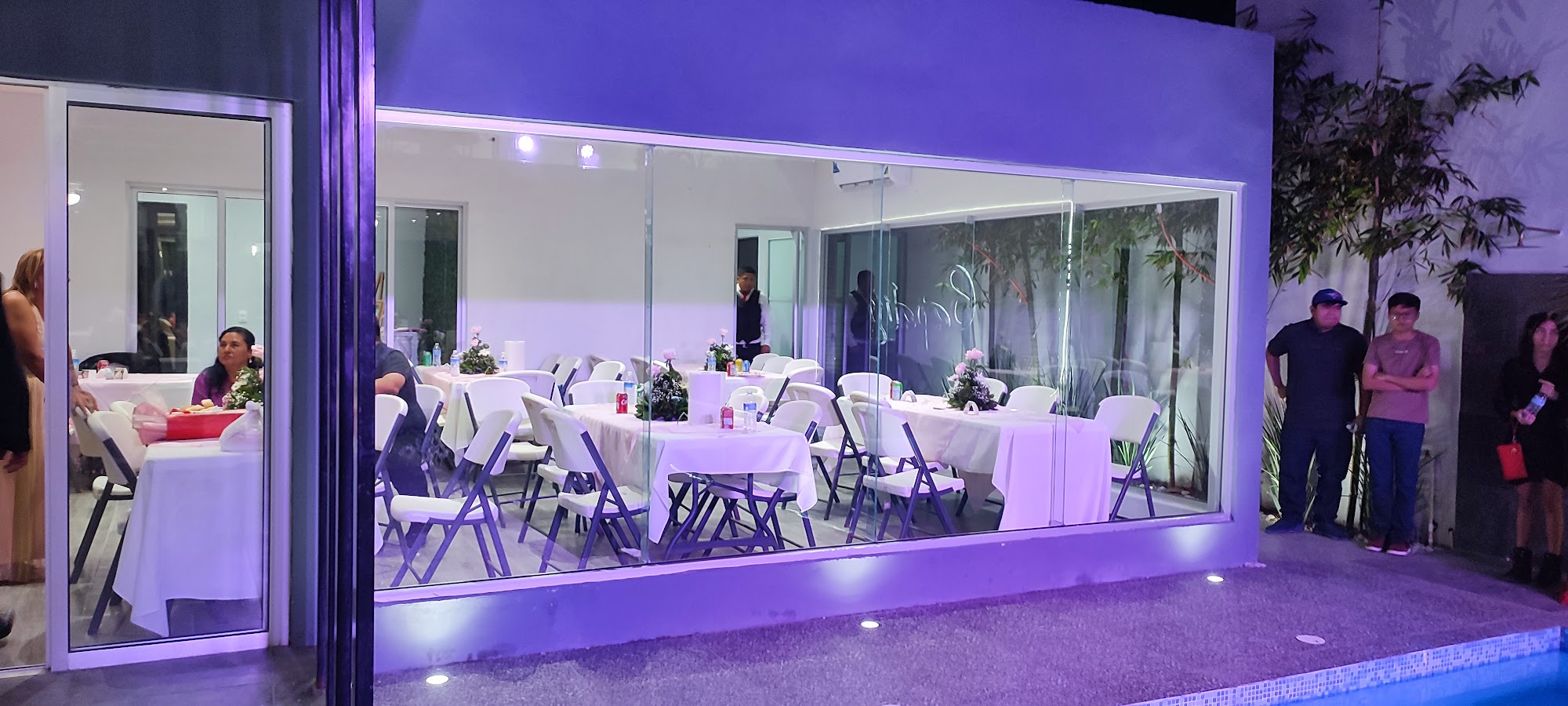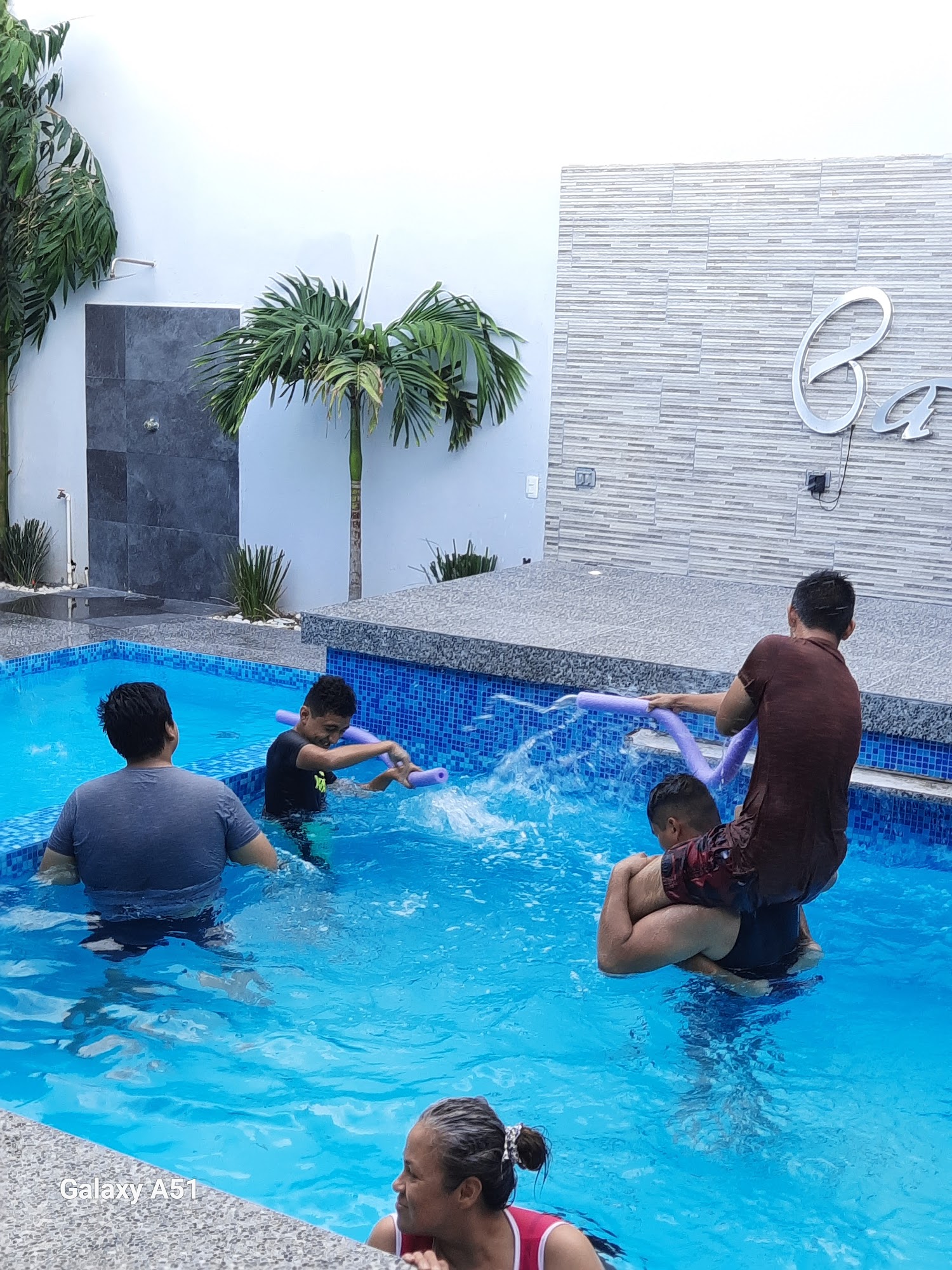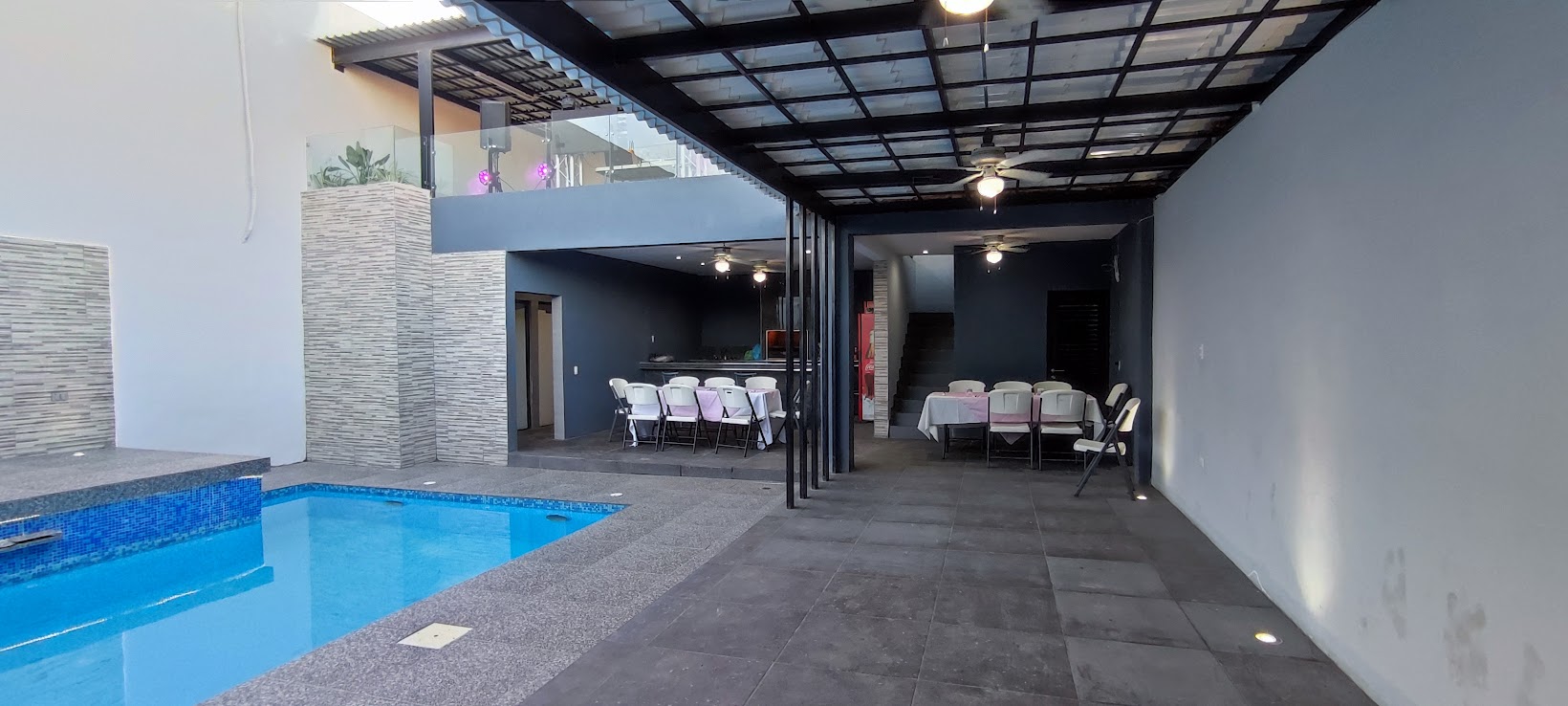 Alberca grande con chapoteadero para niños, también cuenta con espacio cerrado para mesas, y una zona con techado en el área de la alberca que tiene cuenta con una barra y asador, así como un segundo piso algo chico tipo zona vip. Recomendado para eventos chicos con no más de 50 personas. Para nada caluroso