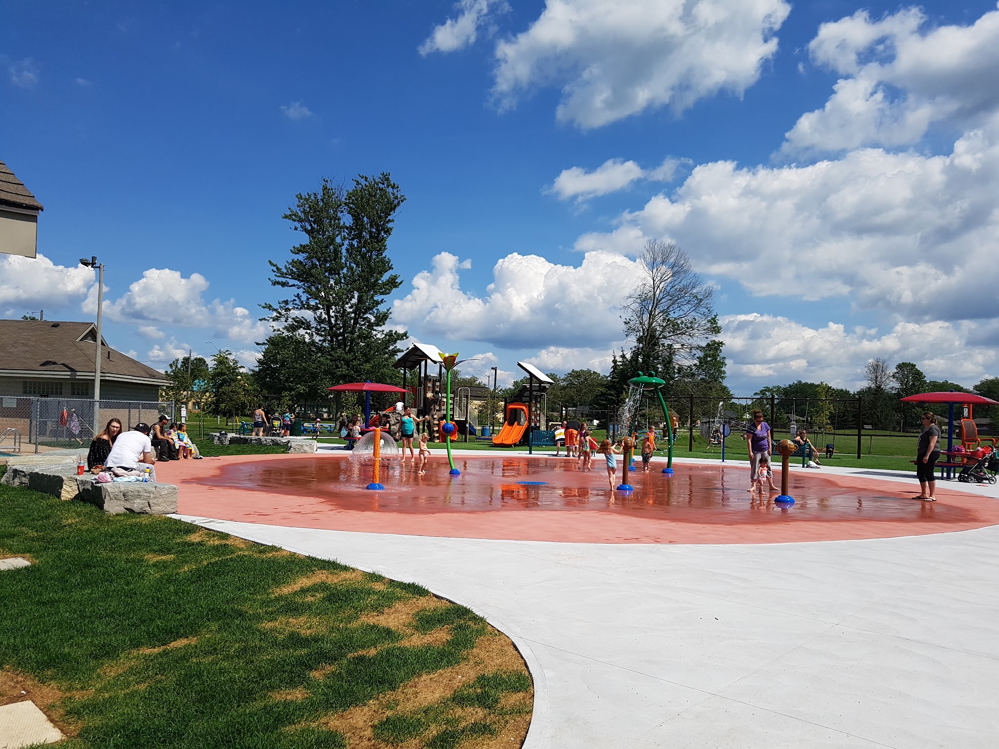 Good for kids and families. Playground, splash pad, swimming pool. Washrooms.
