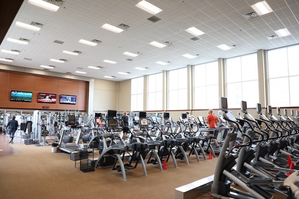 Multipurpose recreation center featuring an equipment-filled gym and indoor and outdoor pools, plus a sauna.