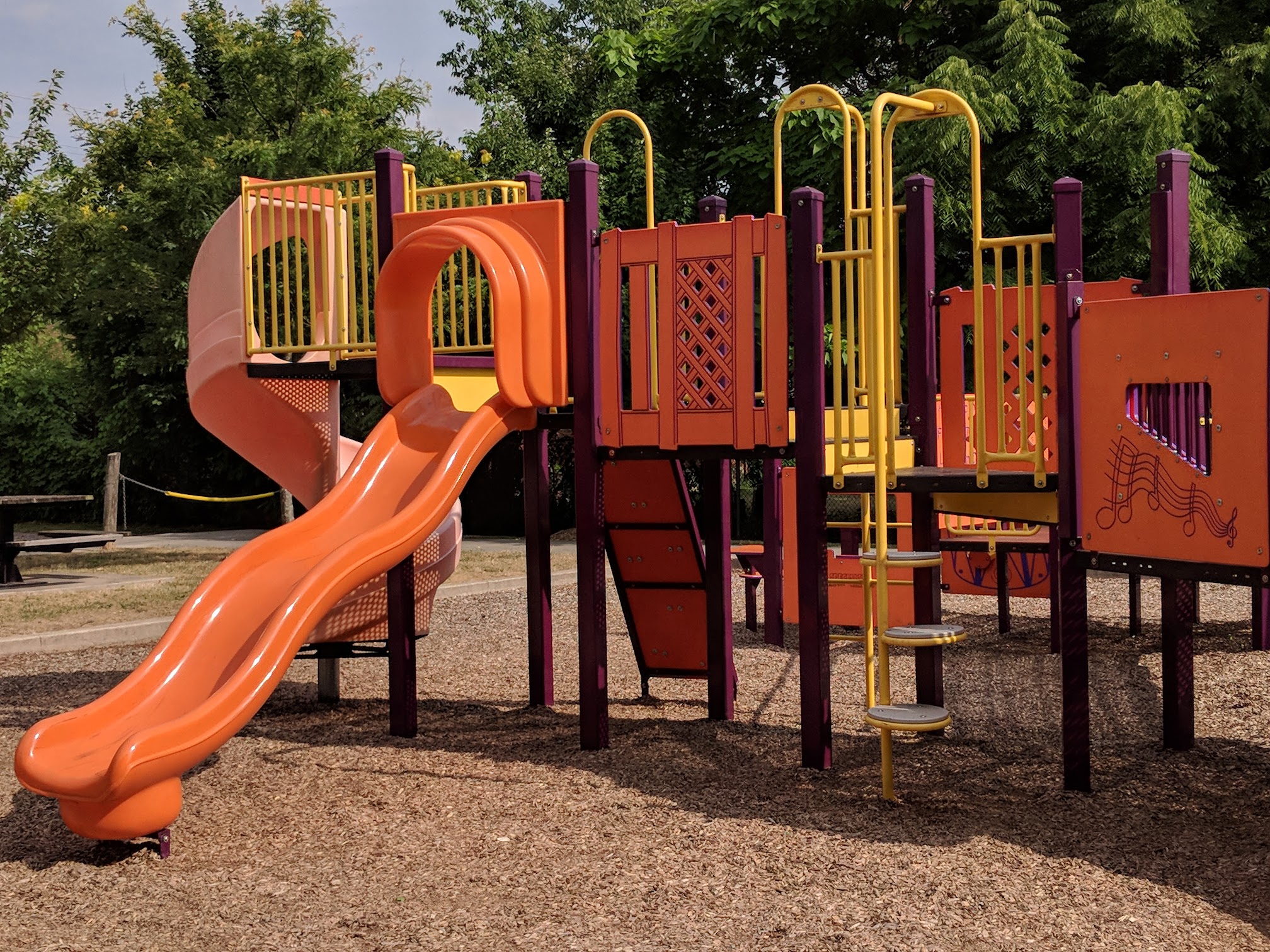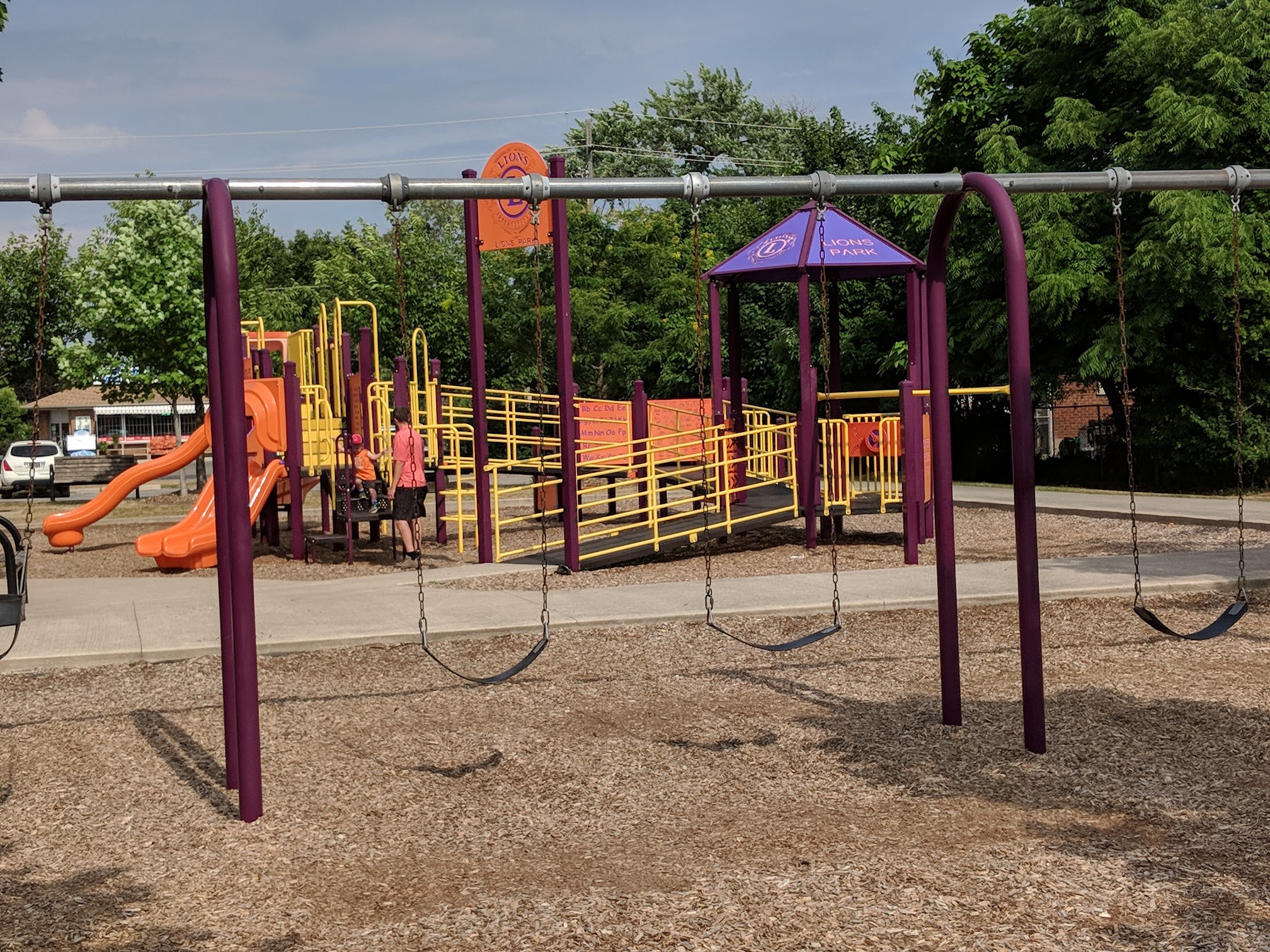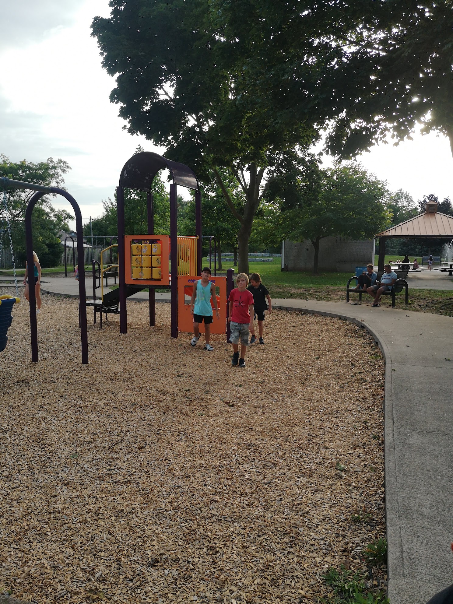 Great park, play place is wood chips. Lots of benches, has covered seating beside the splash pad, play area is a good size, monkey bars, slides, swings, picnic tables, perfect for a picnic or splash pad date for the kids. Theres a switch on the floor of the splash pad that needs to be pushed in order for it to work. I haven't seen the pool open yet.