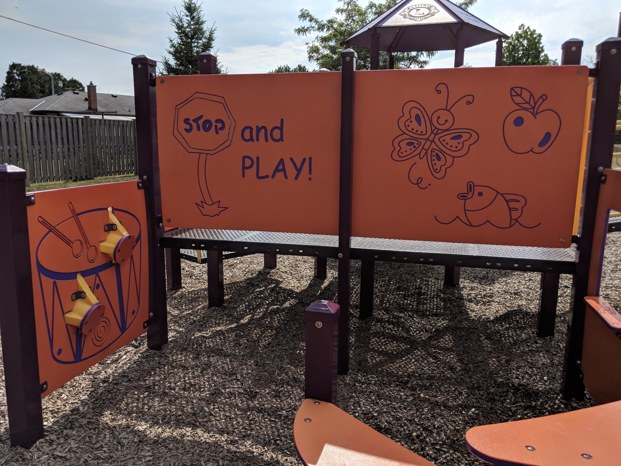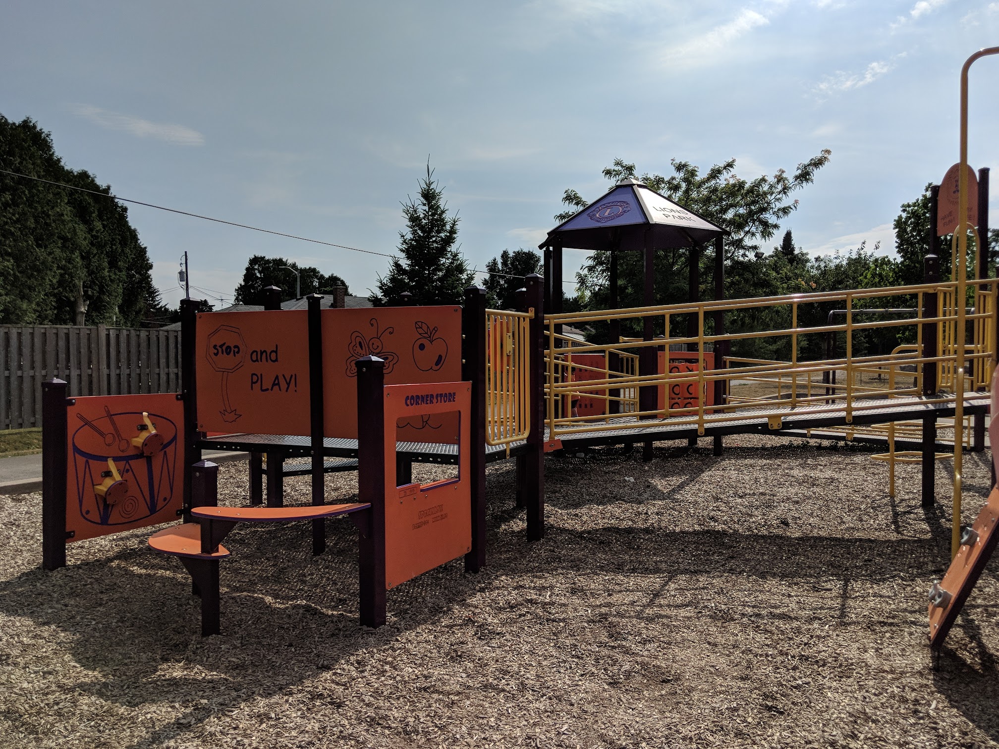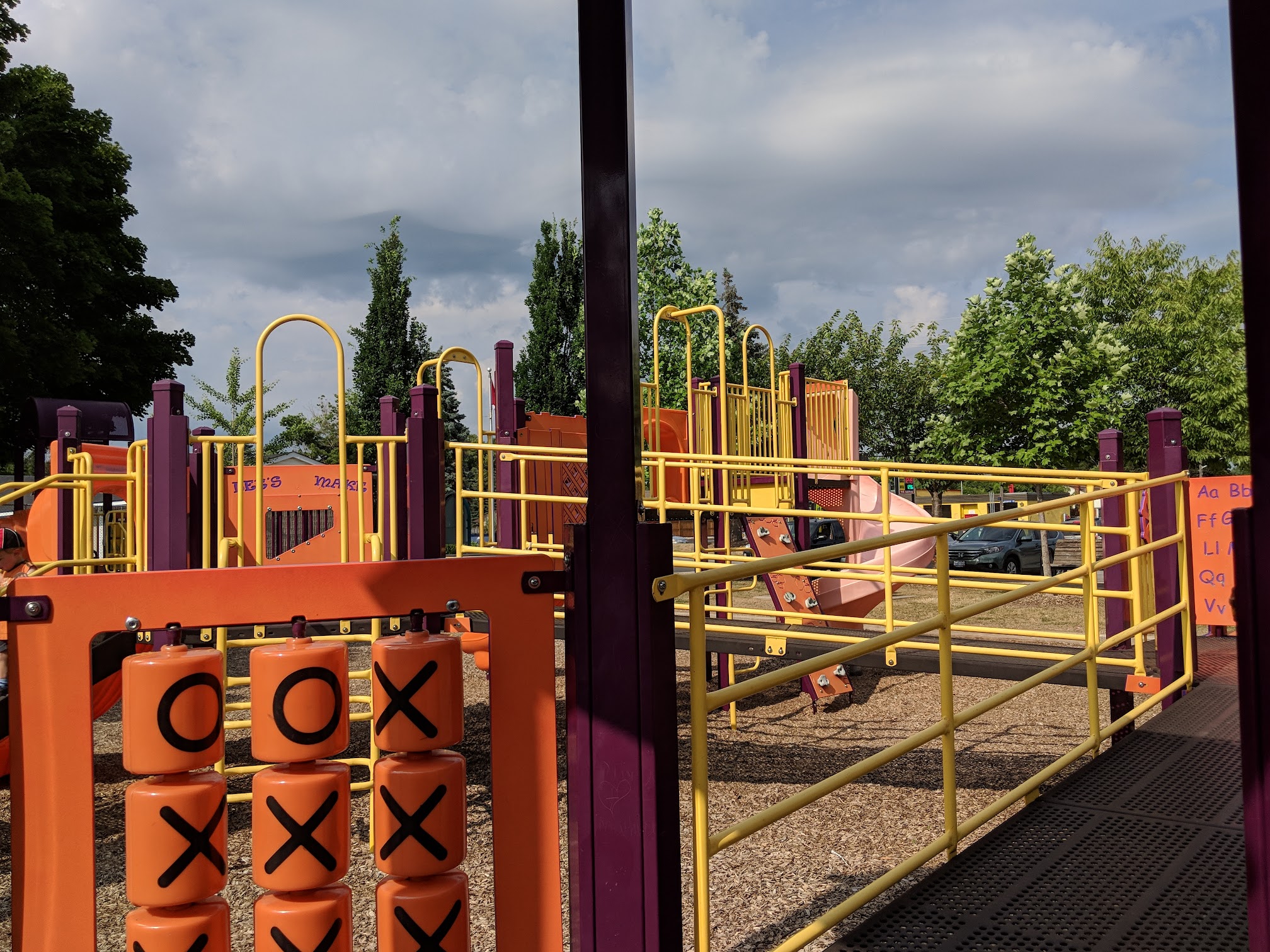 Great park, play place is wood chips. Lots of benches, has covered seating beside the splash pad, play area is a good size, monkey bars, slides, swings, picnic tables, perfect for a picnic or splash pad date for the kids. Theres a switch on the floor of the splash pad that needs to be pushed in order for it to work. I haven't seen the pool open yet.
