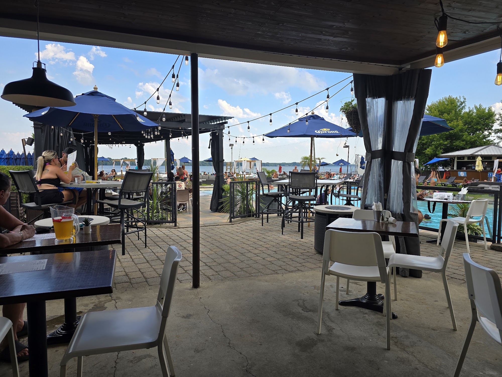 What are people saying (AI review summary)? The establishment generally offers a great atmosphere and location by the water, described as a 'down south' escape. Staff are often polite, professional, and attentive for general service and check-in. The pool is appreciated for its good water temperature and fair admission price, although several reviews noted issues with debris and dead flies. Food quality receives mixed feedback; some found it very good, fairly priced, and with generous portions, while others experienced extremely long wait times for food, soggy items, and rude service staff when inquiring about delays. Drink quality was praised by some, but slow drink service was also reported. While the general crowd is good, some weekend experiences were negatively impacted by rowdy and disrespectful patrons. Visitors are advised to reserve, arrive early for parking, and be aware of the strict no outside food or drink policy.