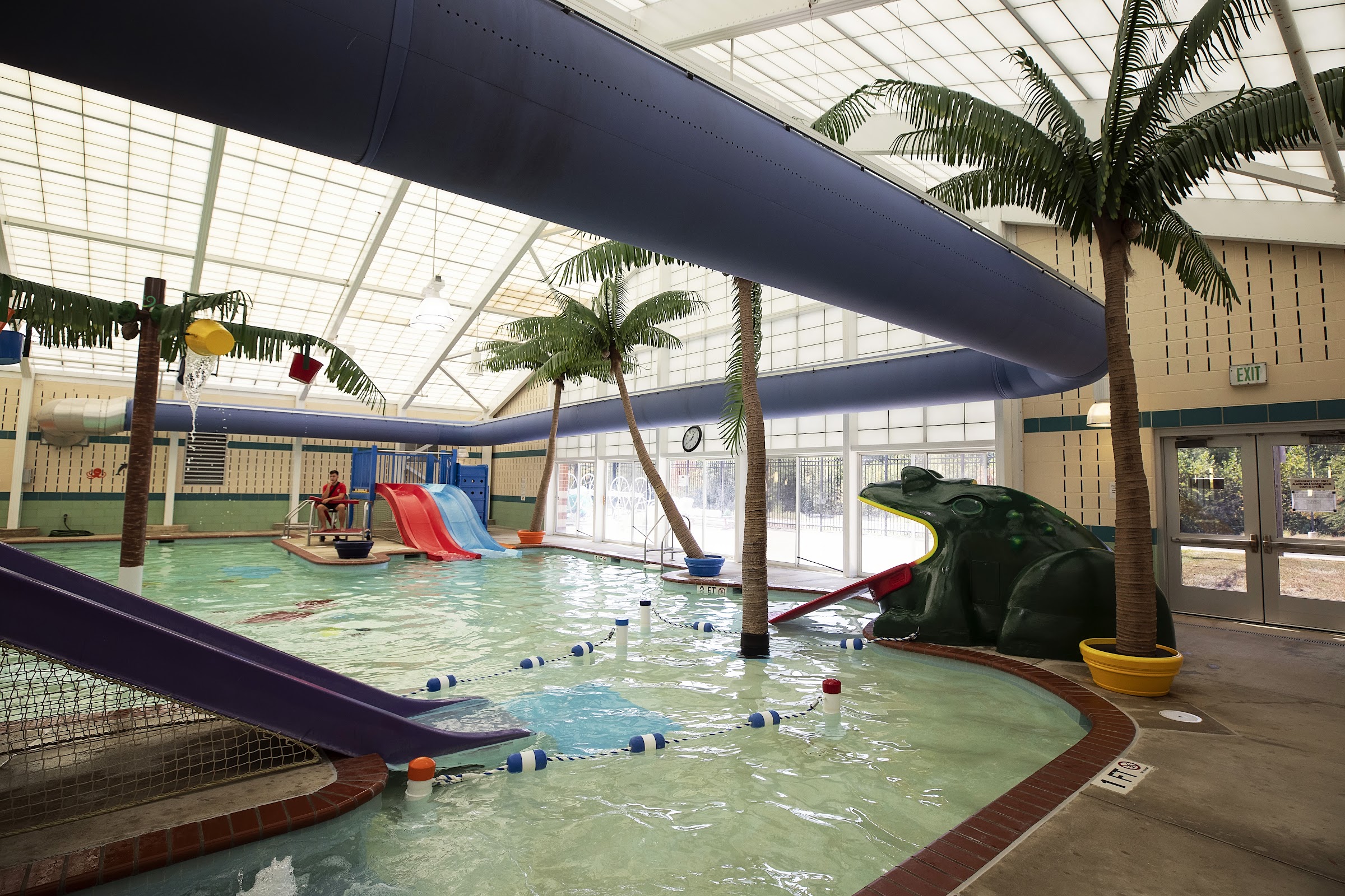 Indoor aquatic center with a large pool, diving boards, a hot tub, and a kiddie pool, plus a gym.