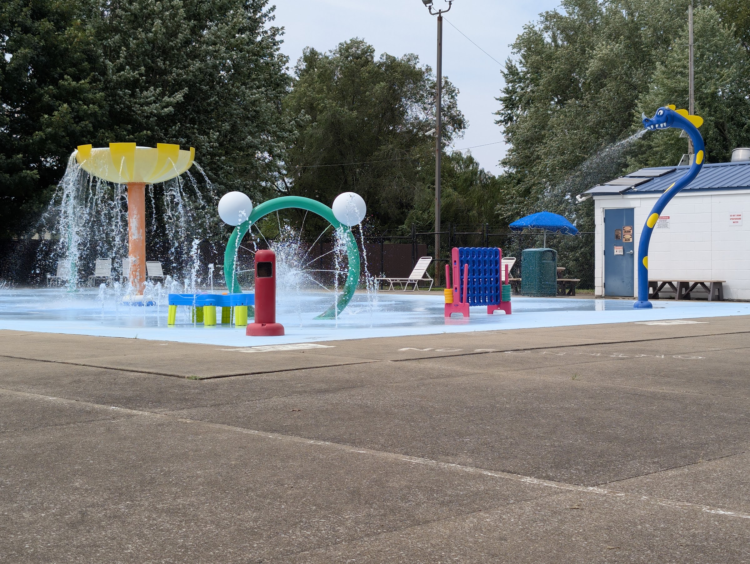 Water park with a splash pad and picnic tables, plus a restroom and a dog park.
