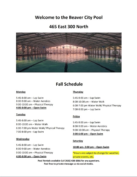 The Beaver City Swimming Pool, located at 465 E 300 N St, Beaver, UT, is a seasonal outdoor aquatic facility managed by the City of Beaver. It serves as a community hub during the warmer months, offering various activities such as open swim, family swim, and swimming lessons for local residents and visitors.