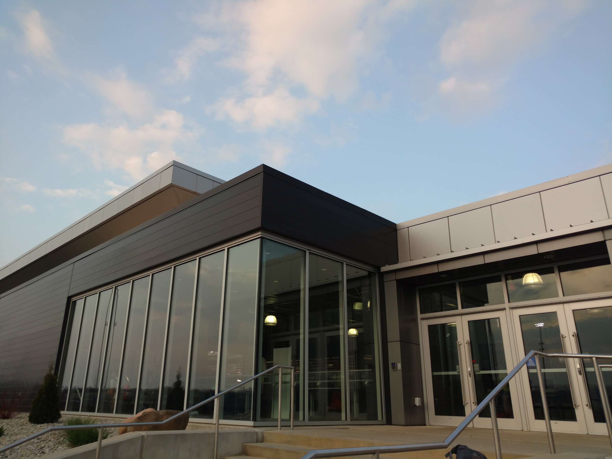This aquatic center is a small version of some of the nicest aquatic centers in the Midwest. Seating and tables in the common area. These are not terribly comfortable but appreciated. The glass divider between the common area and the pool is a very nice touch. Did I mention that there is a small cafe? Pool is nice and the bleachers are elevated so it is easy to see the athletes.