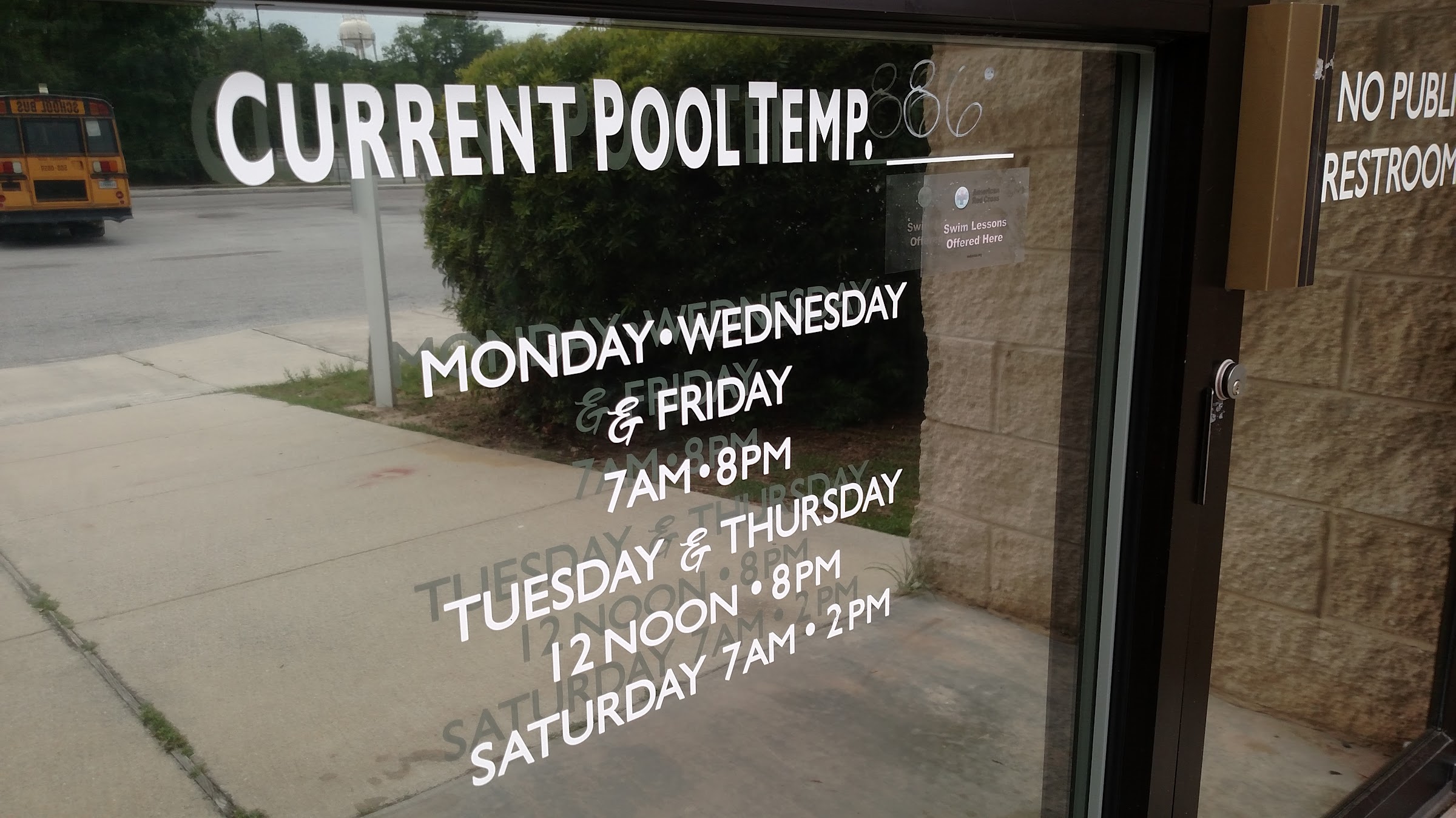 No public restrooms. The BHS Bus Drivers has always been allowed to use the restrooms, But not anymore. Can you imagine after a long trip having to go else where, when your park out is right in front of the pool. I don't support them anymore. I'll take my business else where....
