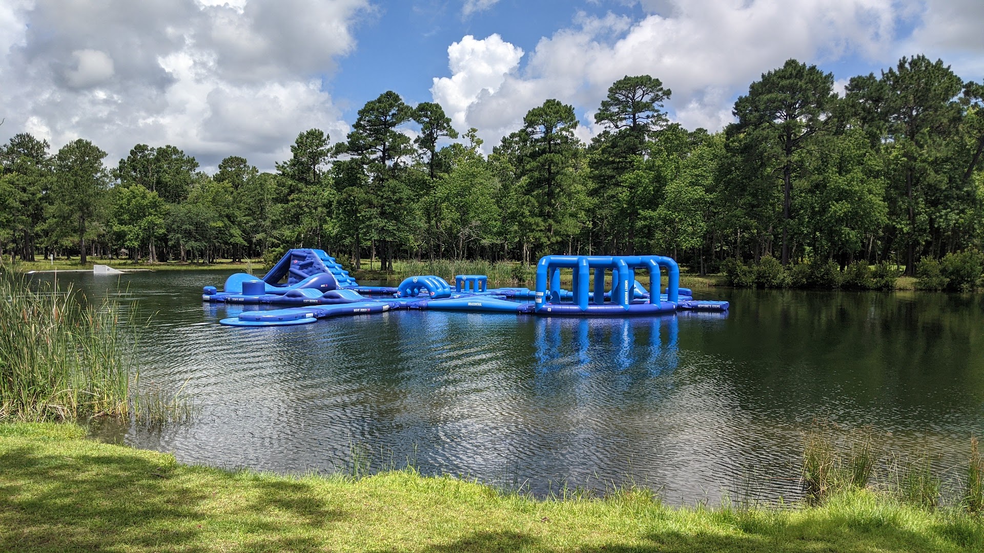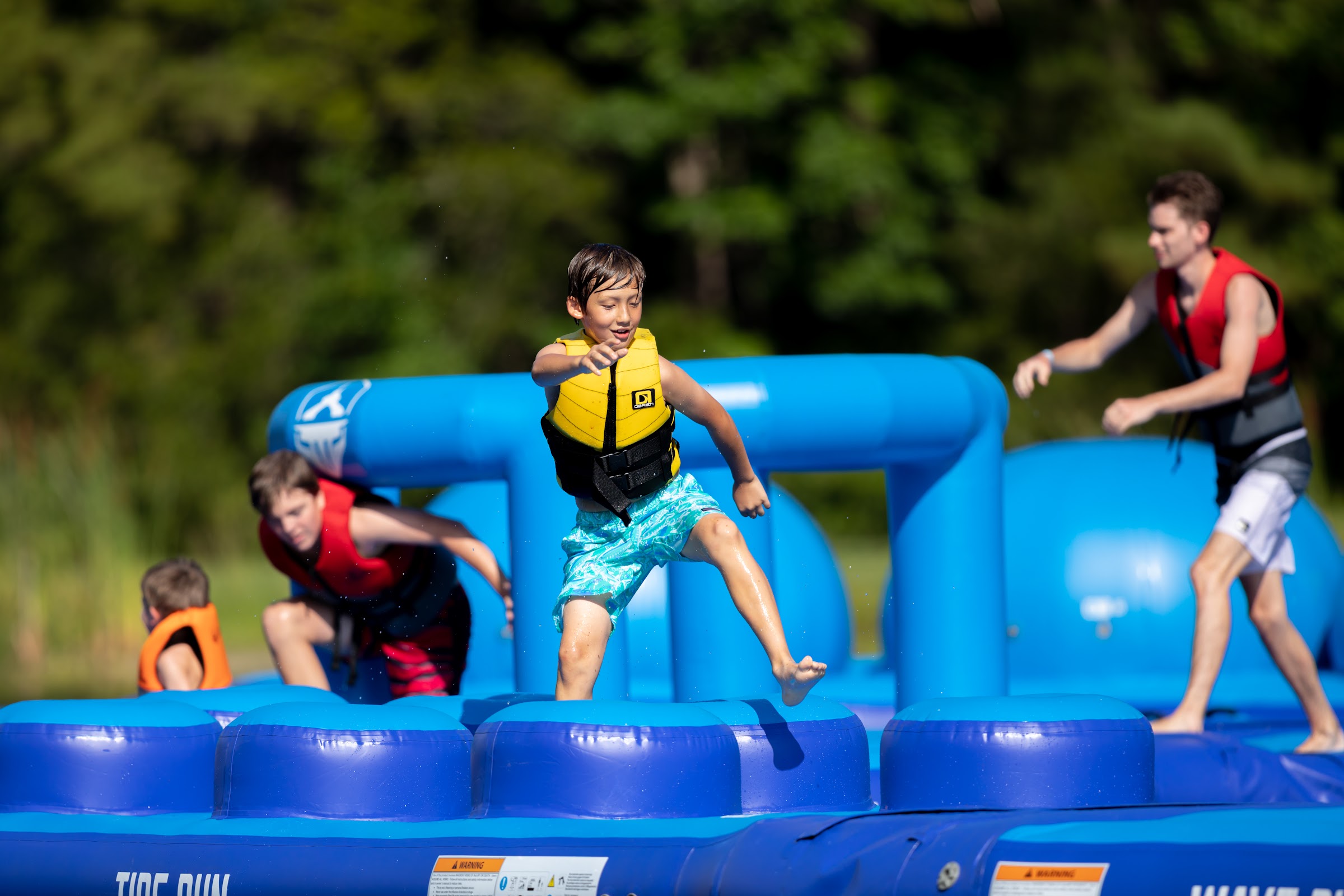 Family-friendly park featuring an aqua course with inflatable slides, plus a lake for wading and wakeboarding.