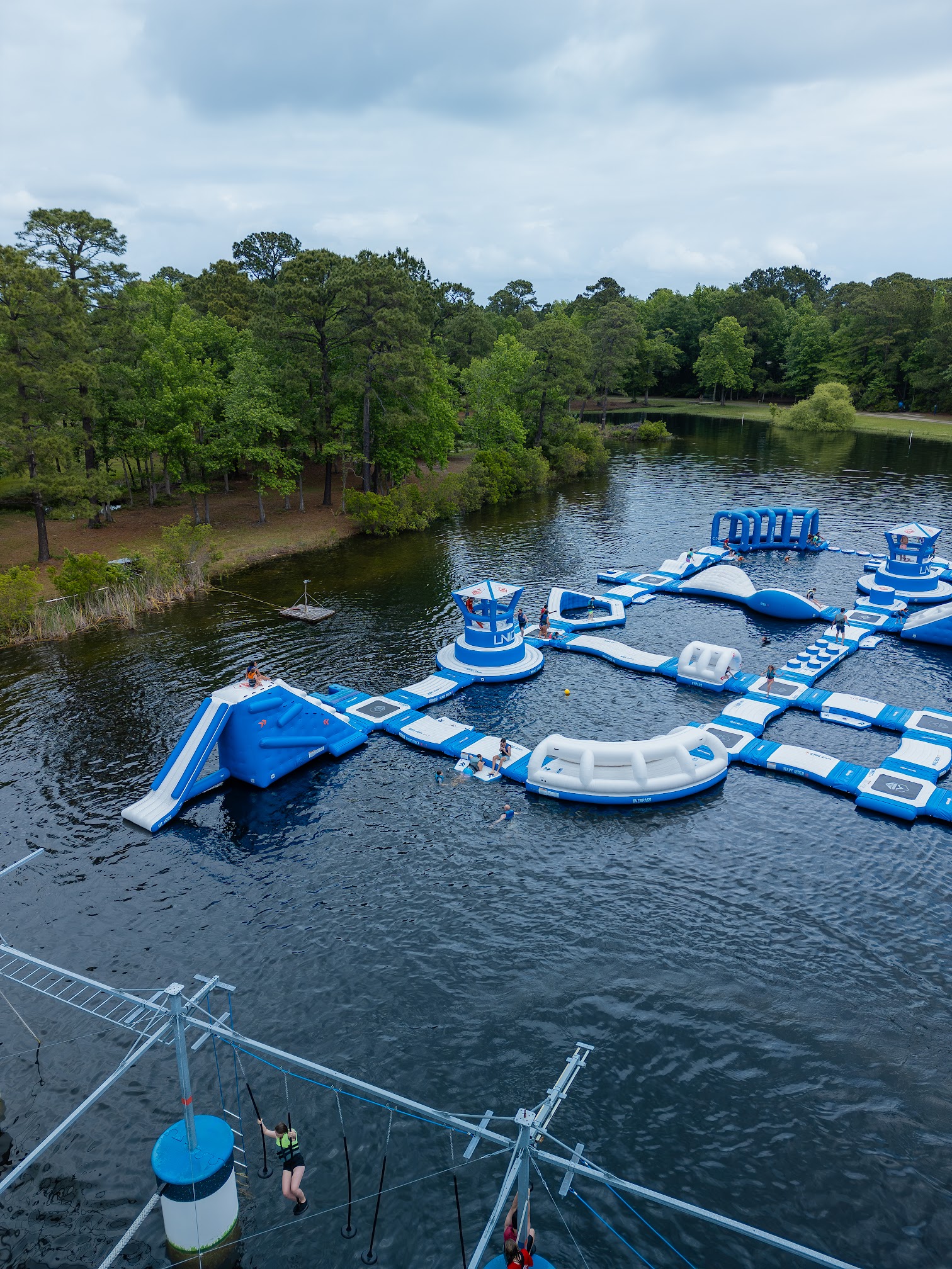 As Charleston Aqua Park is situated on a natural lake, the water temperature is not artificially regulated. It reflects the ambient weather conditions and seasonal changes, being natural lake water that typically warms up during the summer months.