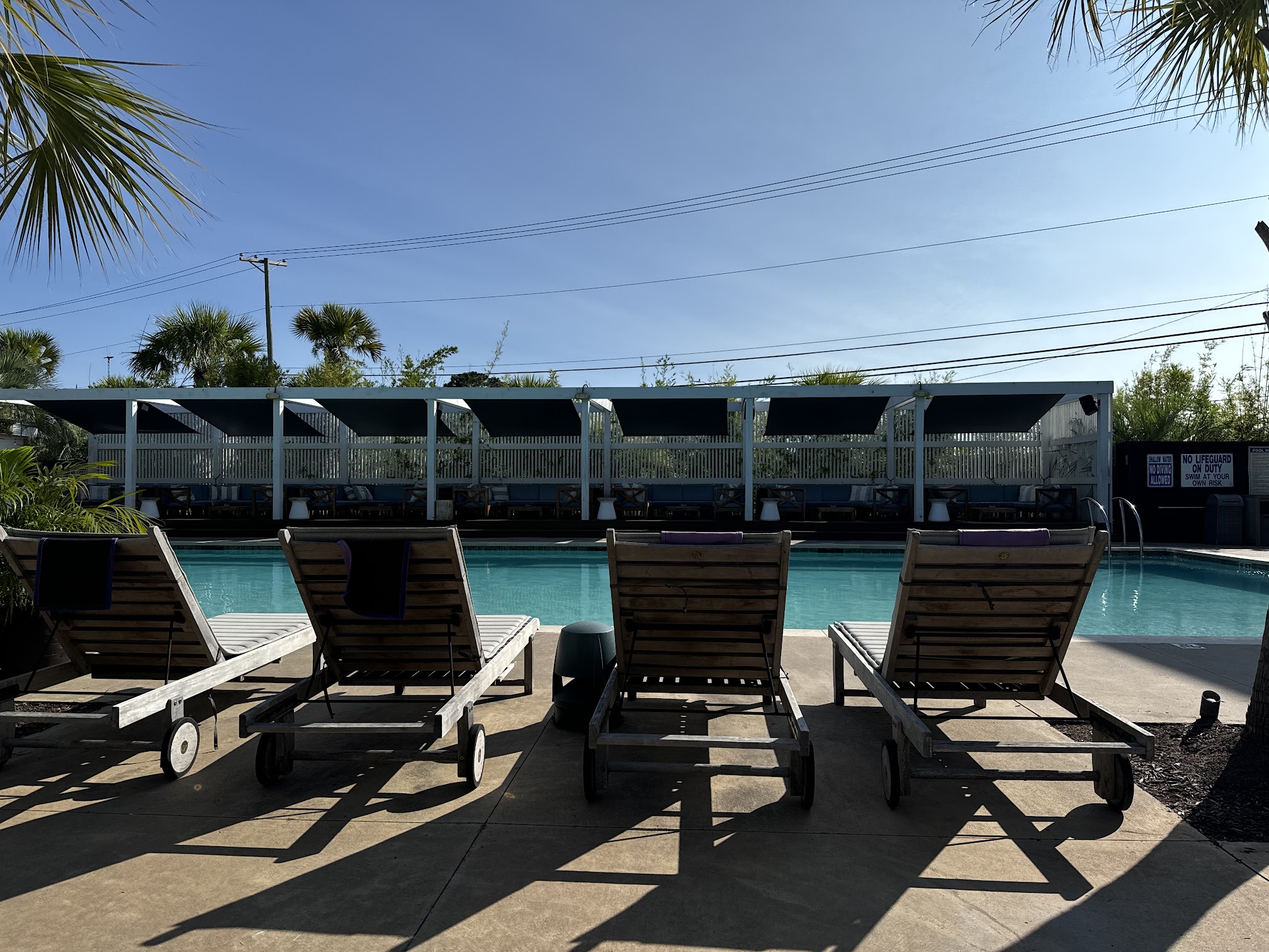 Good concept but if you aren't a member, you will cook in the sun without shade. The loungers with umbrellas are for members only. There are cabanas but the cost is too high for one person. Service was very very slow. I ordered a salad and it took so long I asked to cancel and just get my check. Then suddenly my salad appeared, but it took another 30 mins to get my check. The pool was nice...not freezing but not hot. They do have a DJ and it was a good time but the no shade made it hard to hang out for very long.