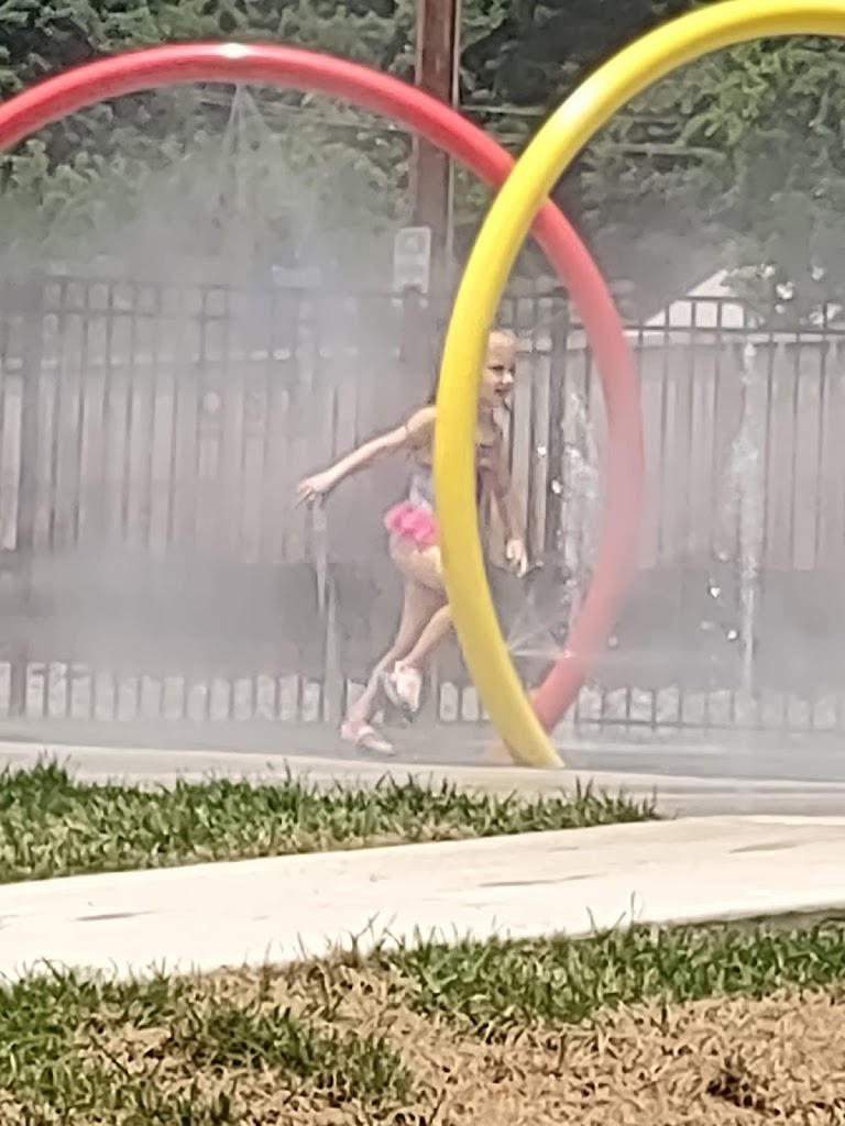 Good clean place for the kids to play on a hot day. Just push the button on the blue pole to get the water going.