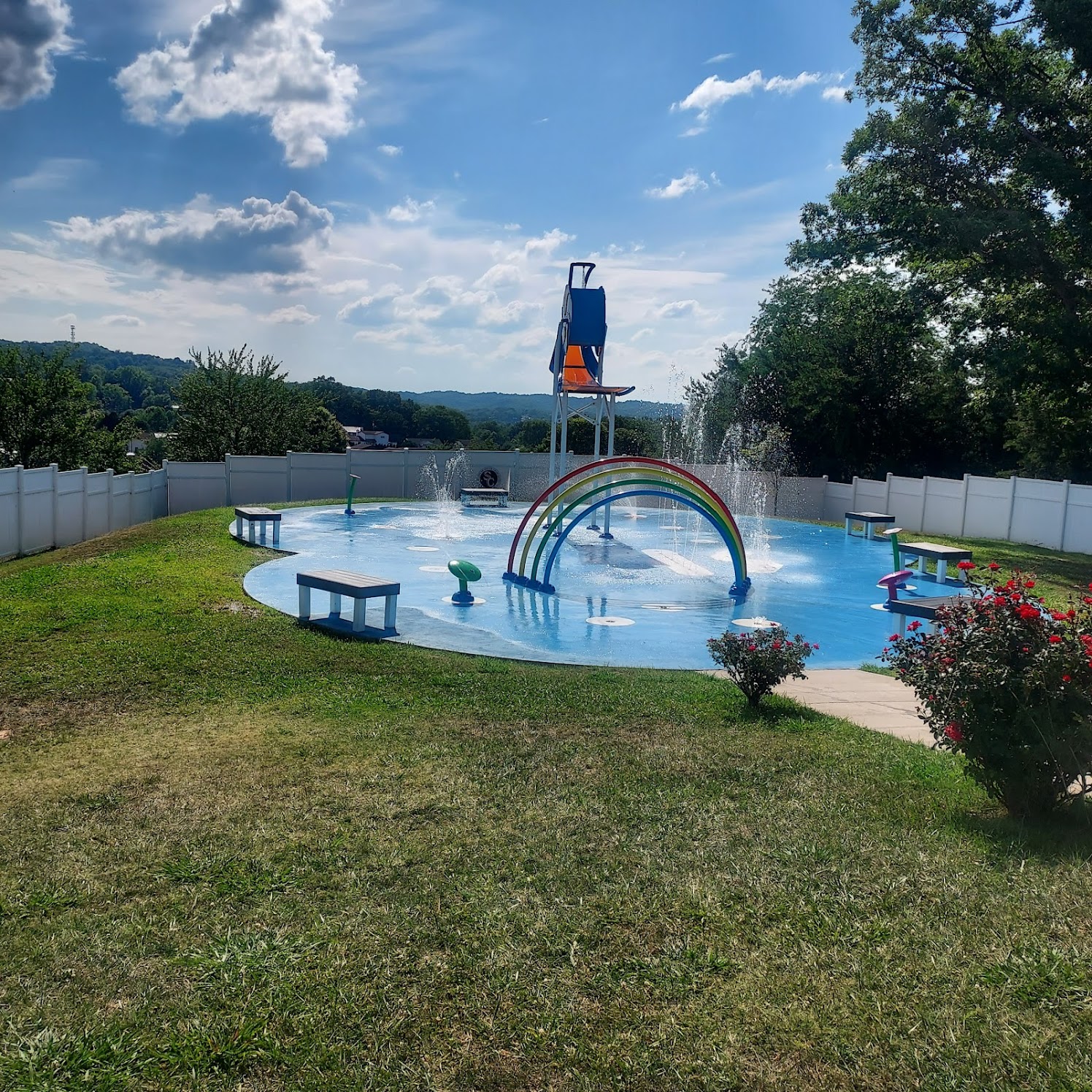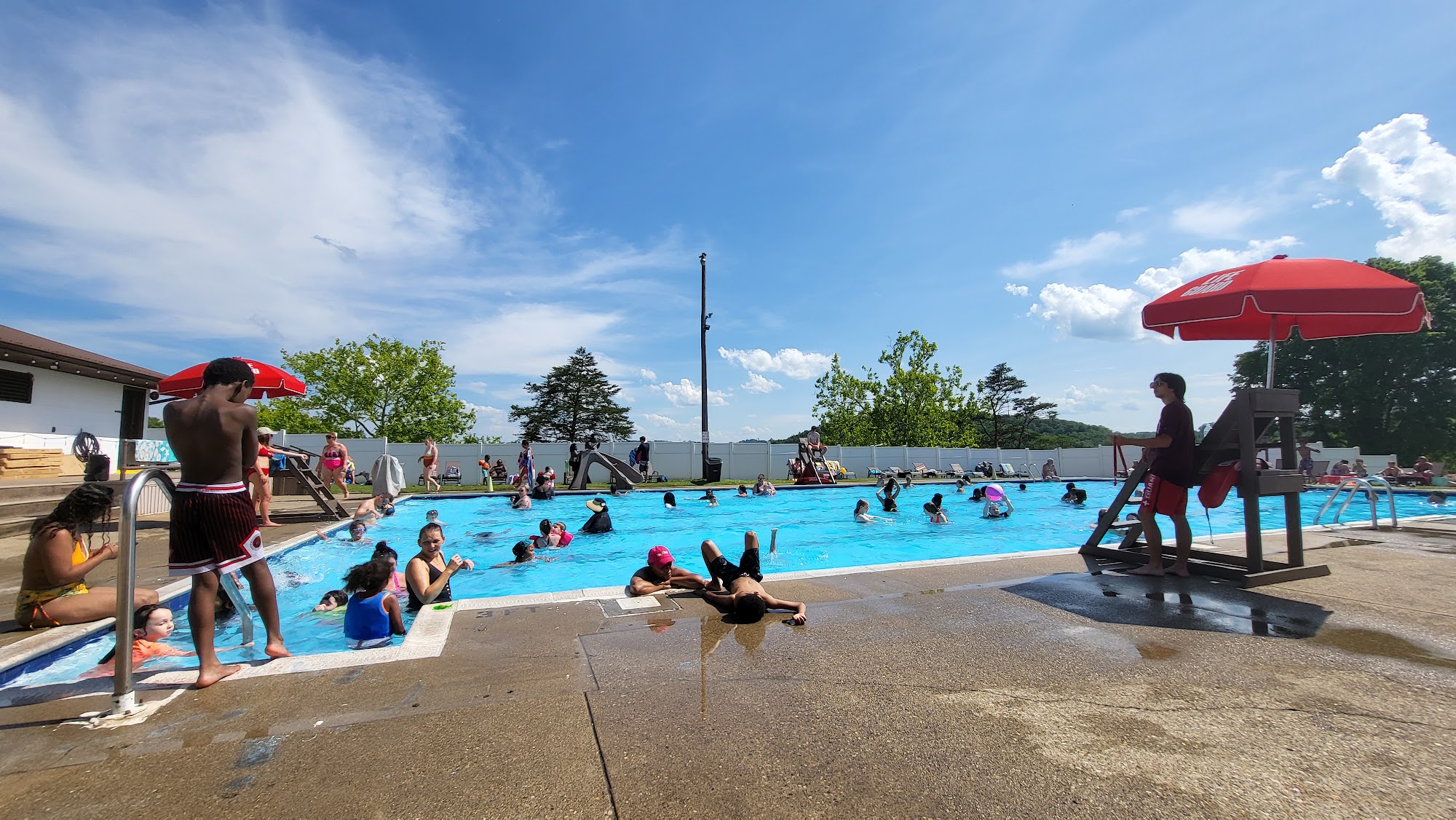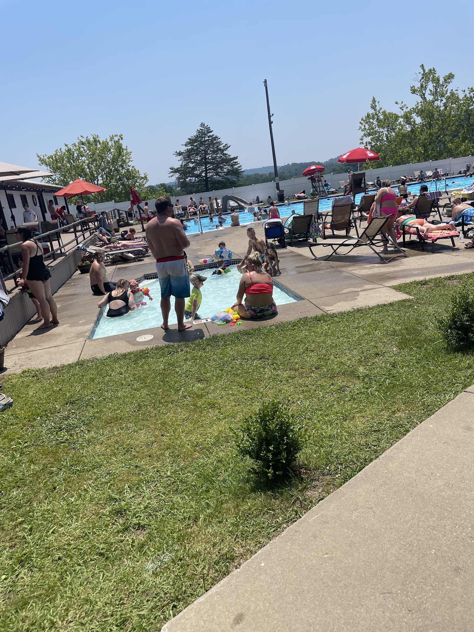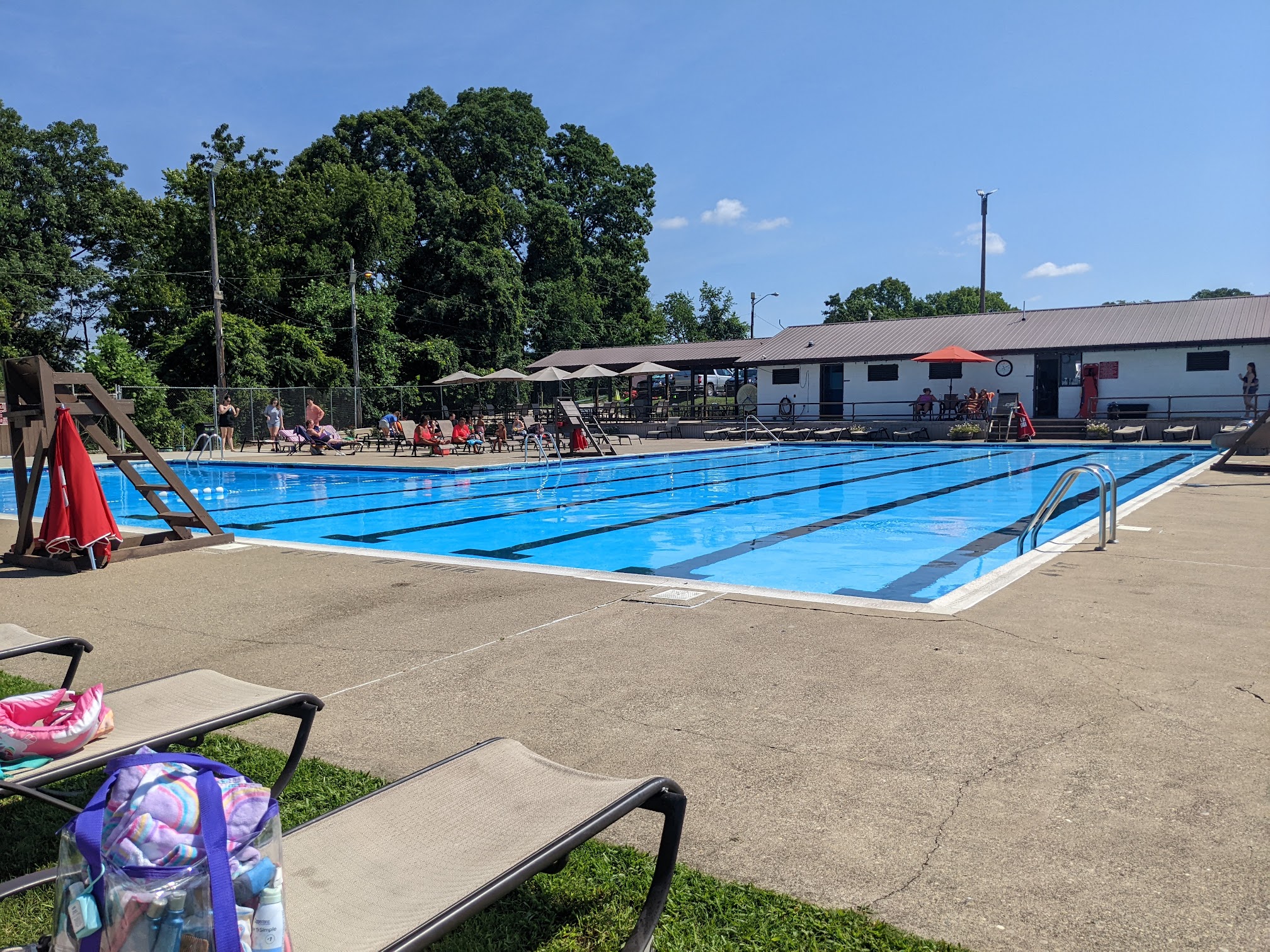 We had such a good time today and the weather was perfect! There were no daycares there today (it's busier when that's the case). We got there at the opening and everything looked perfect. The staff was friendly and ready to work. We had fun on the slide and in the splash park area and then our lunch. They have a very nice area with picnic tables with umbrellas that you can enjoy lunch at. We packed our lunches and had a relaxing lunch escaping the sun for a bit. After lunch we enjoyed the baby pool a bit before getting back into the big pool. The baby pool had toys and a little raft there to play with... We loved that it was stocked with some things. The restrooms were very clean. I was really impressed with the pool today and we can't wait to go back.