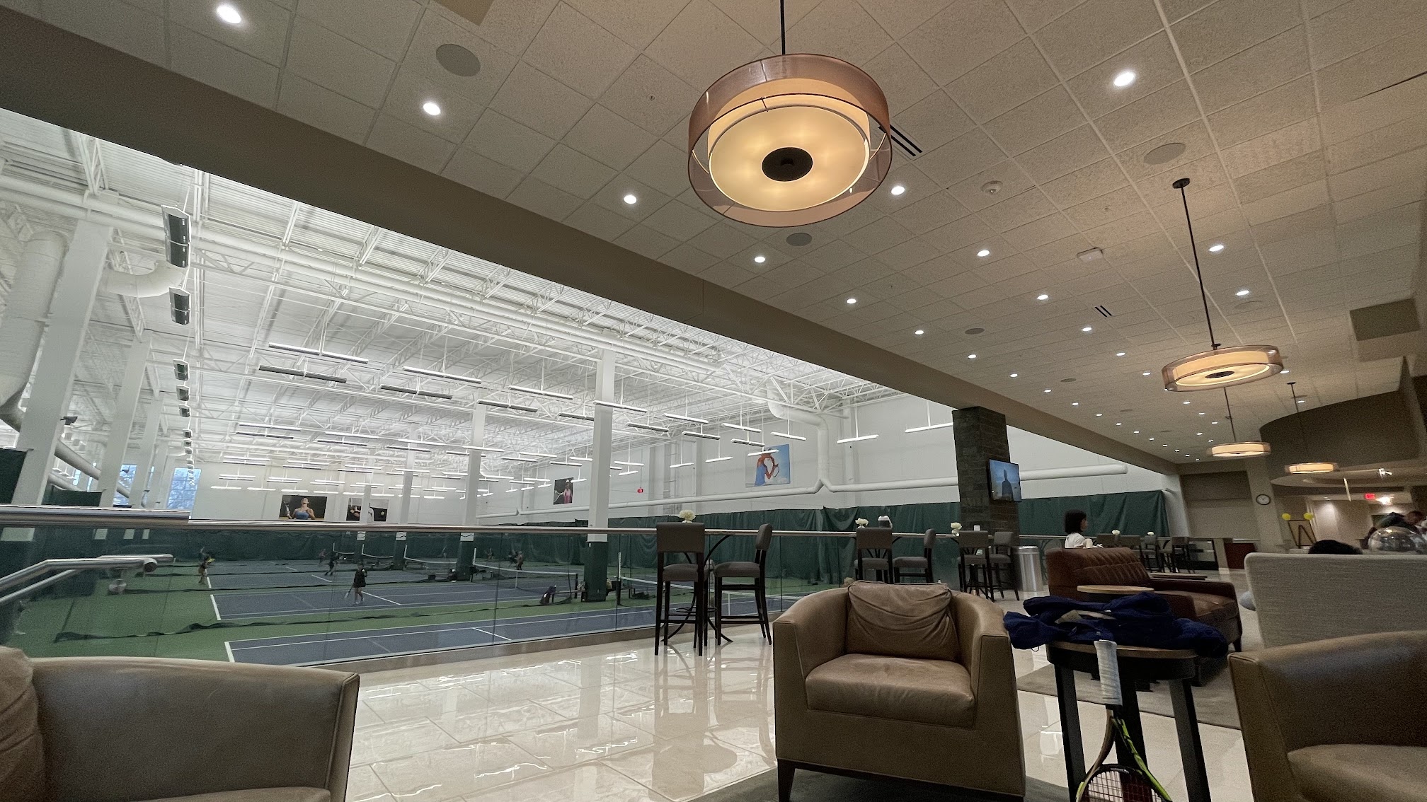 Expansive gym offering a fitness floor, tennis courts, squat racks and a pool.