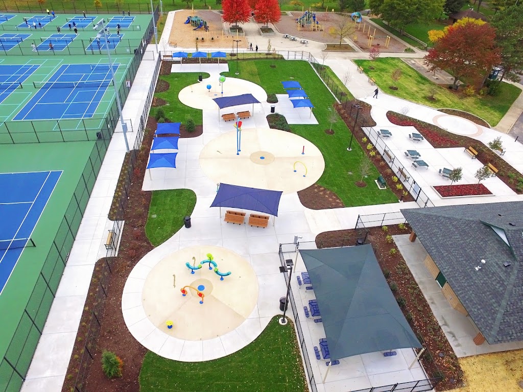 Recreational park featuring miniature golf, tennis and pickleball courts, and a splash park.