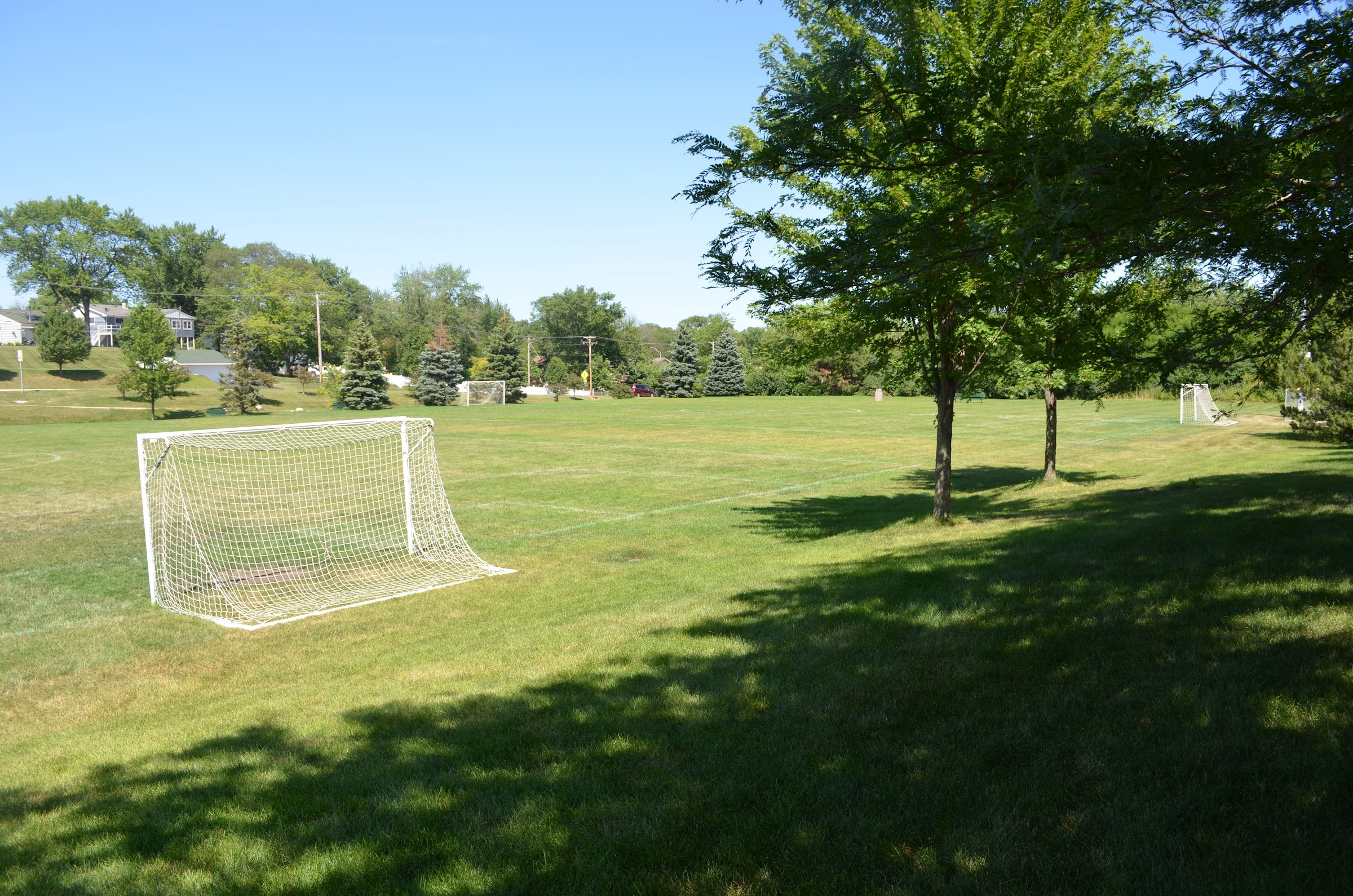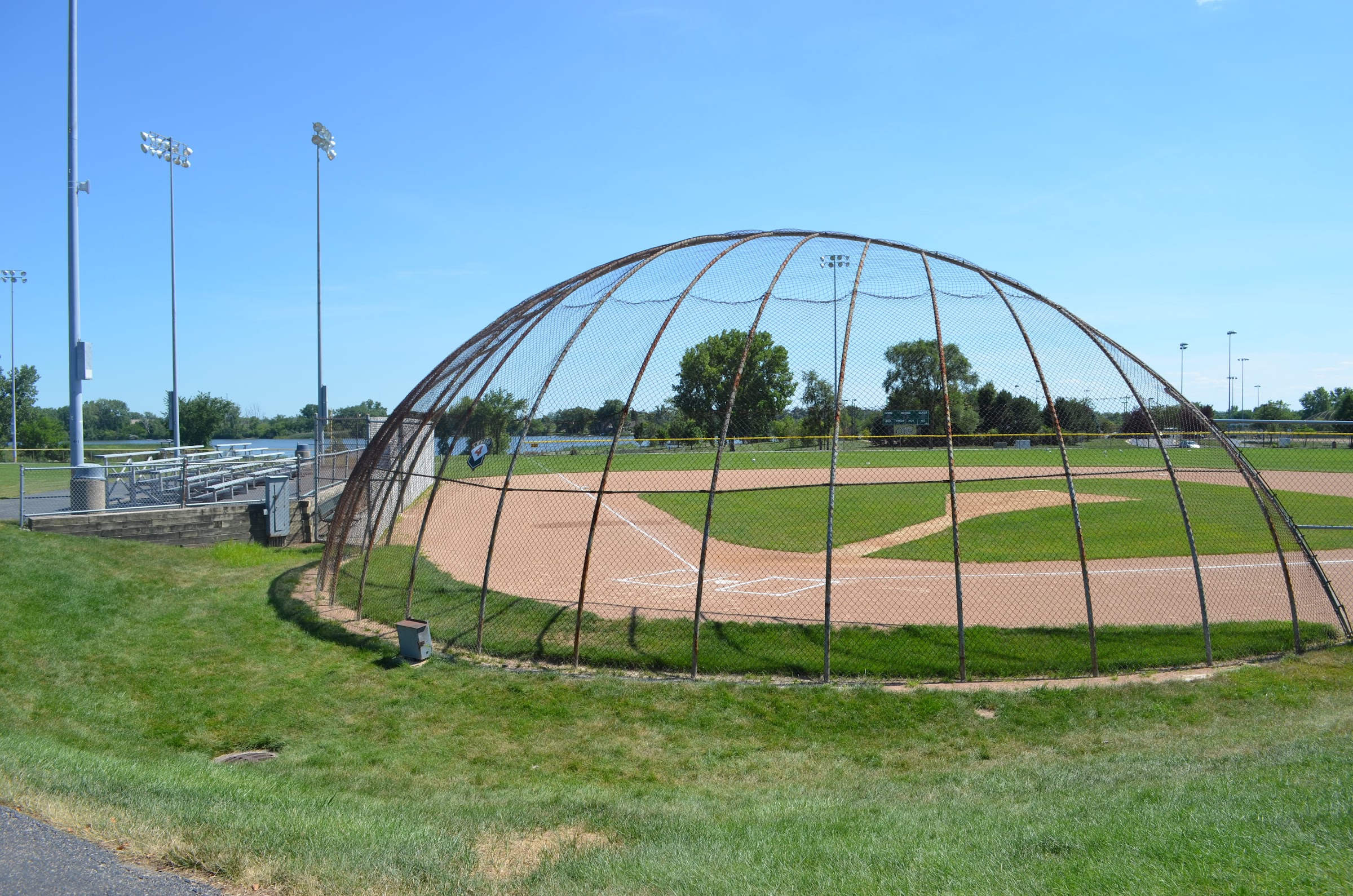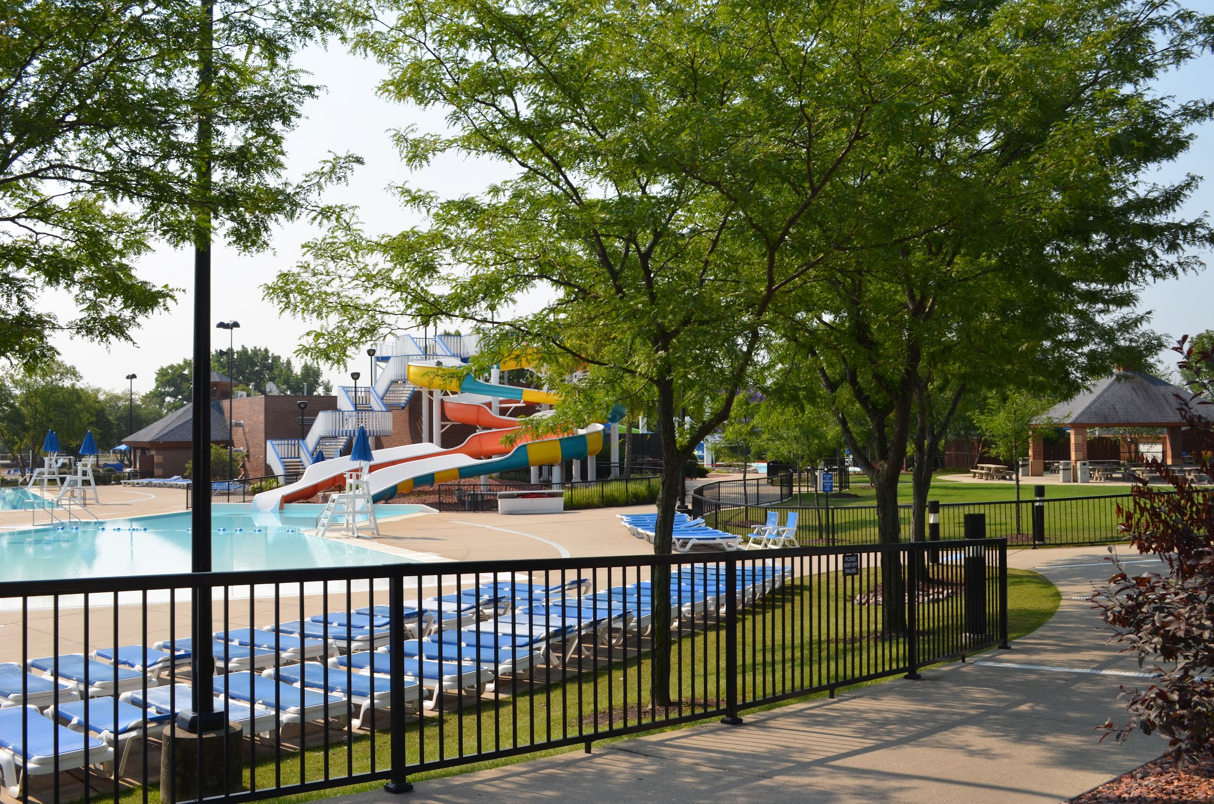 Recreational park with trails and baseball fields, plus a playground and swimming pool.