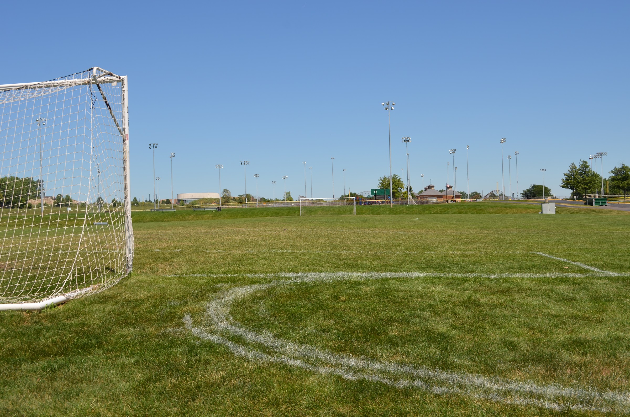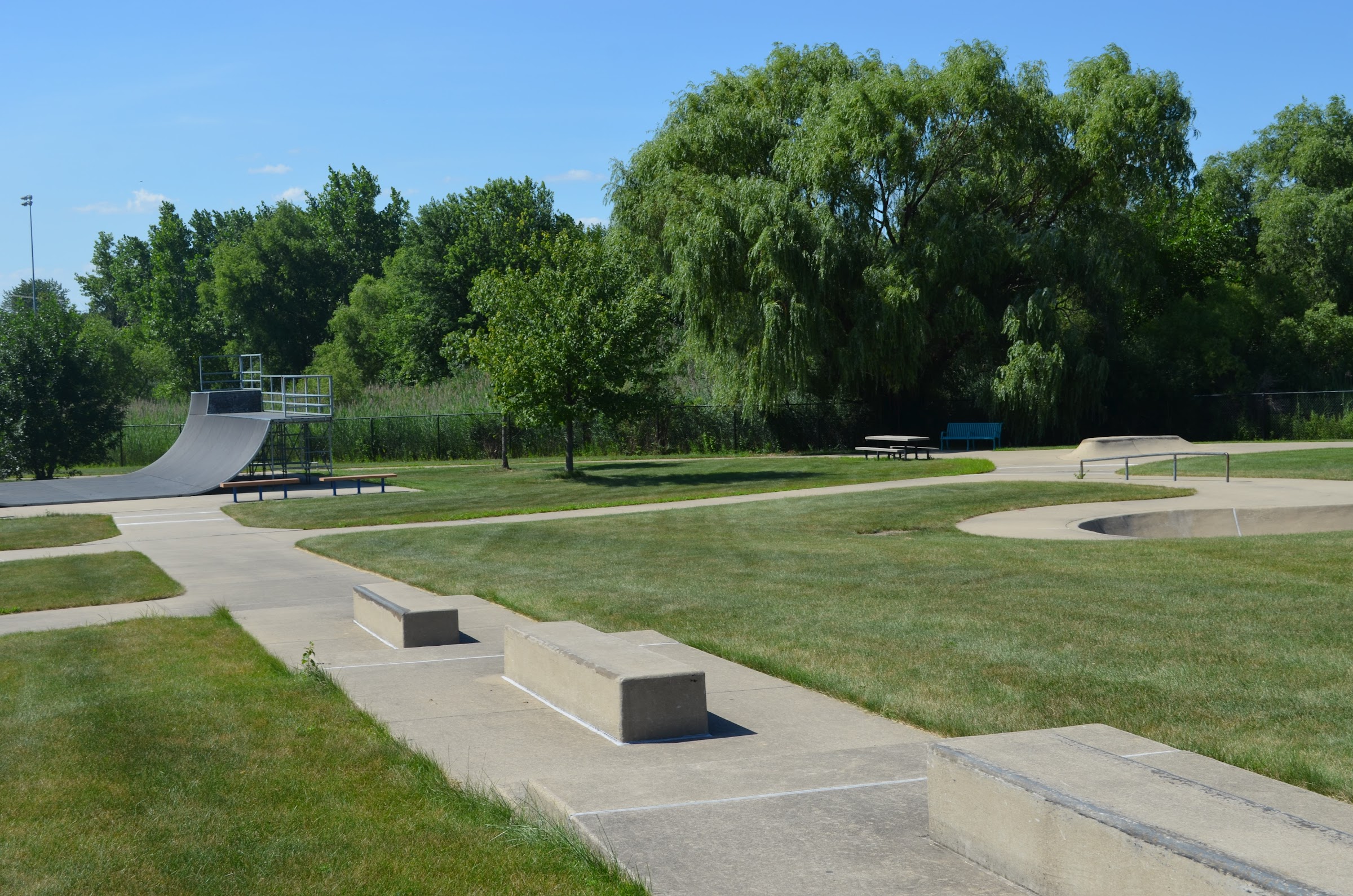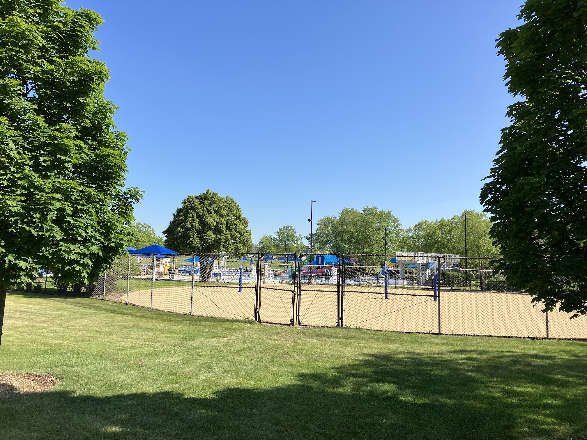 Recreational park with trails and baseball fields, plus a playground and swimming pool.