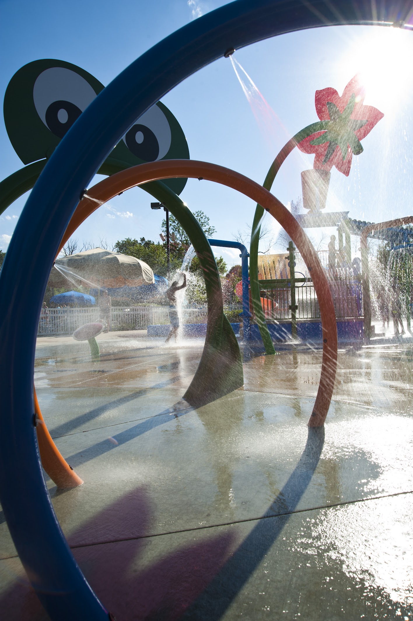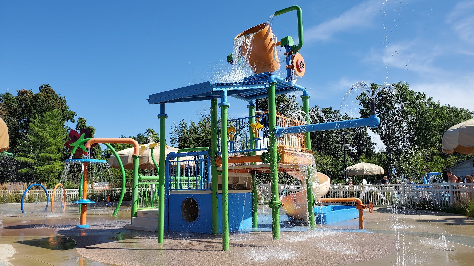 Small water park with a zero-depth pool, water sprayers, and slides, plus a playground.