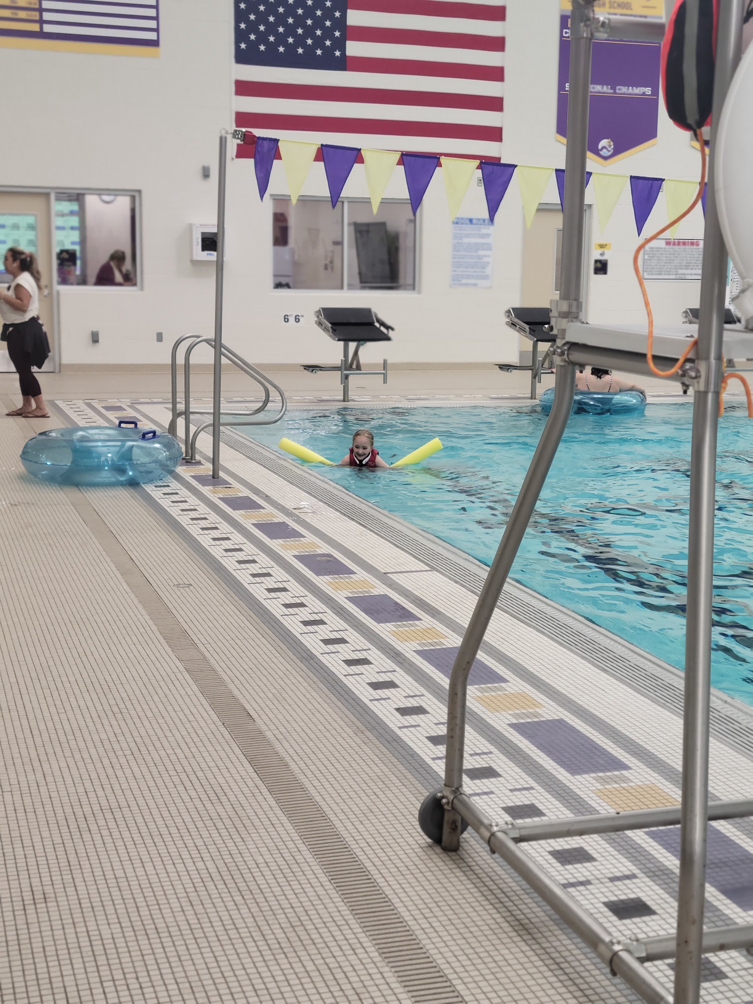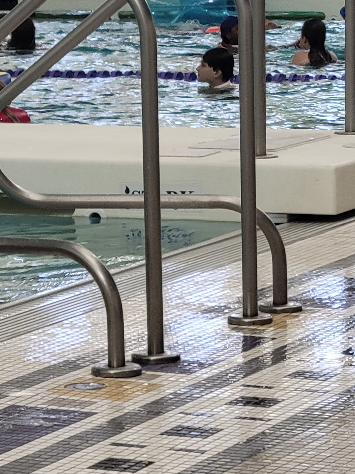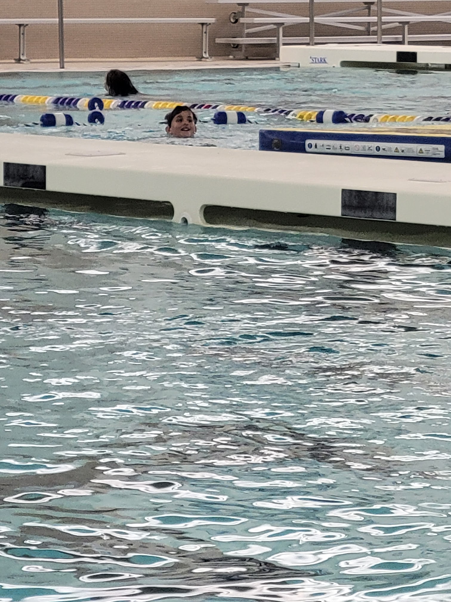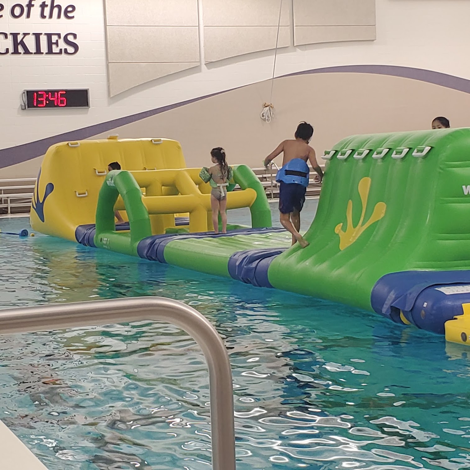 My kids love coming here and I love the cheap pricing, $2 a person or $15 for a pass. They have an aquatic track, lily pads, they show movies on the screen, diving boards, swimming lanes, bleachers to sit, life jackets, and pool noodles. As well as lockers to keep your things in. They require you to wear a headband of sorts to monitor if you are under water for too long, a safety thing but we enjoy it so much