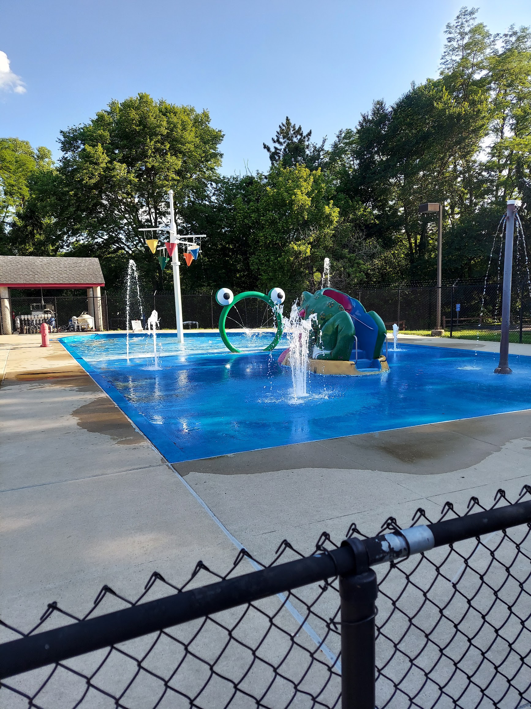 Outdoor city pool with a water slide and a splash pad, plus private party rentals.
