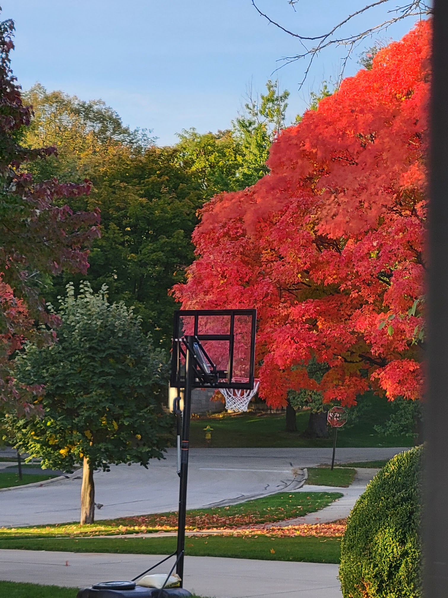 A beautiful view of the burning bush from inside the house. It shows the beauty of autumn that is about to begin.