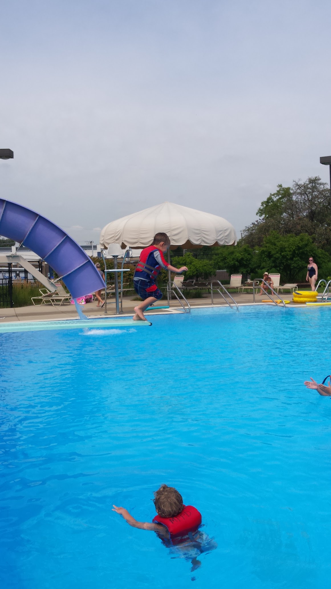 Family-oriented pool with a drop slide and diving boards for kids and adults alike.