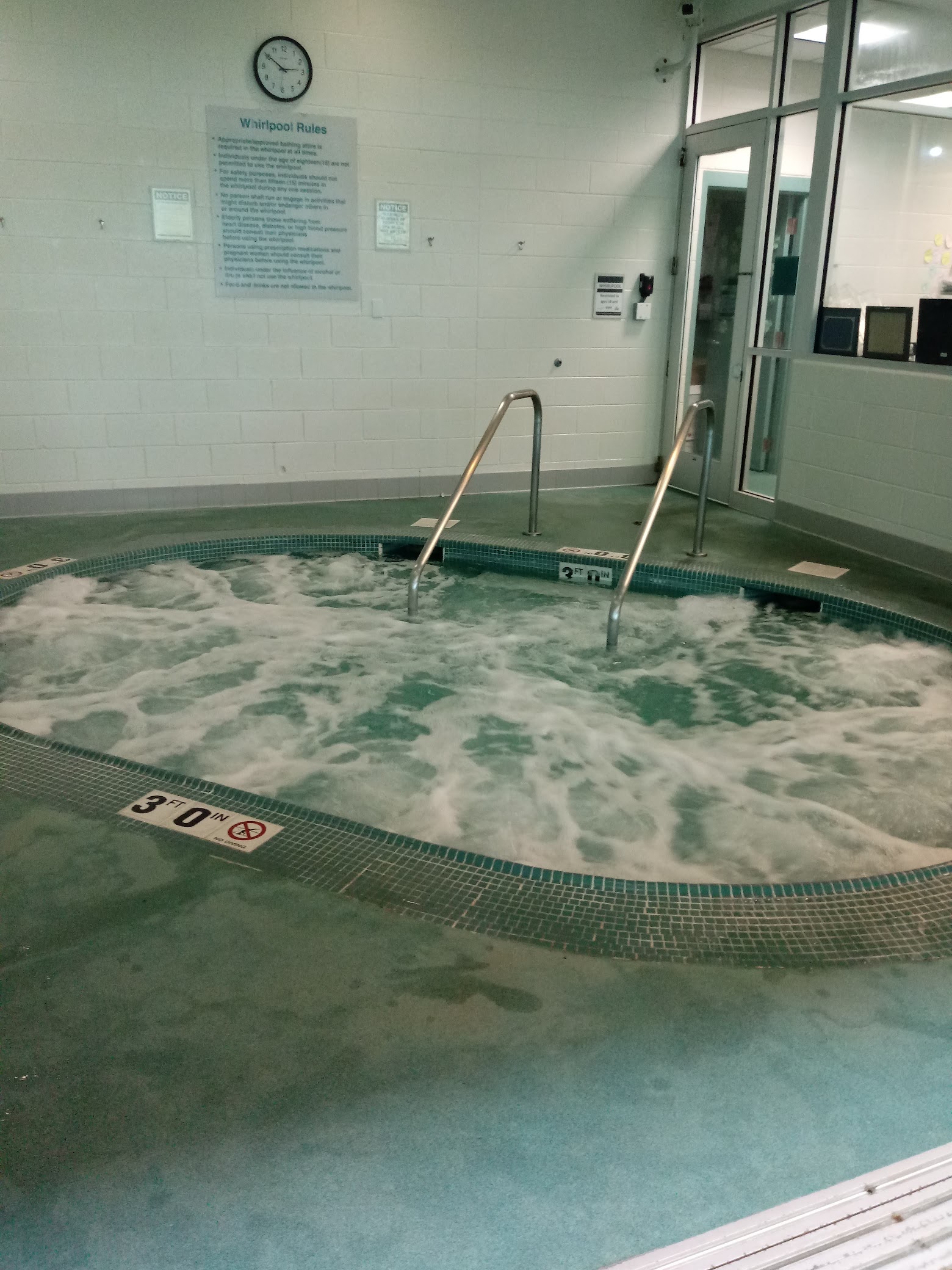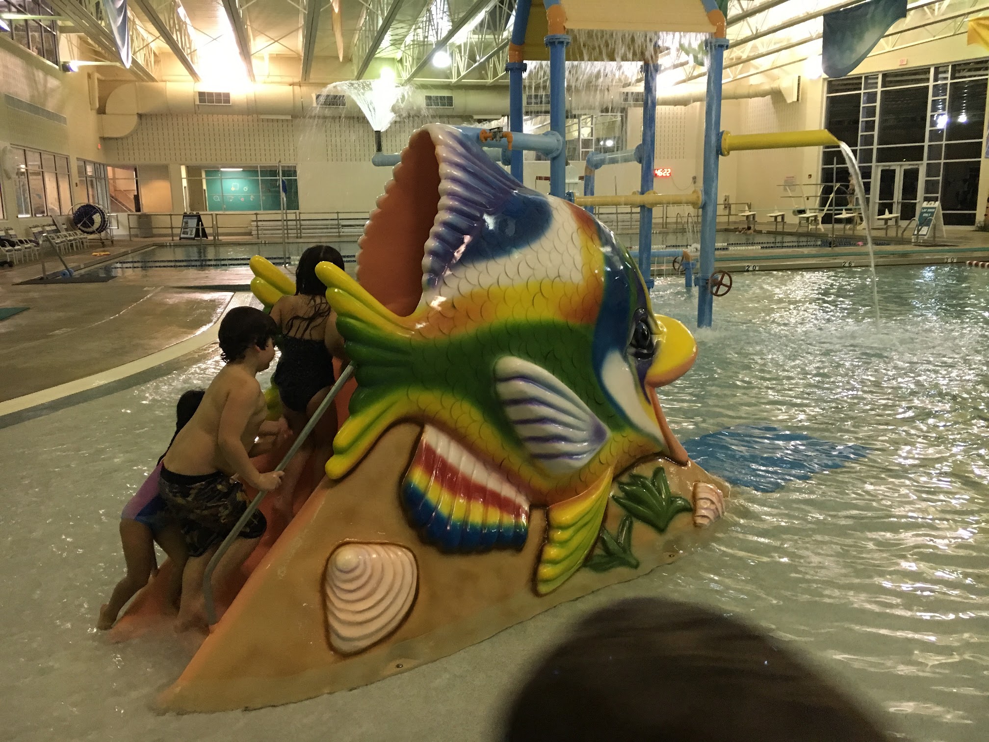 Great little play area. Has a slide for little ones and a big kid slide. Cool water features that spray out water. Clean bathrooms and changing areas. Also has lockers but you need to bring your own lock. Plenty of lifeguards around who are attentive and alert. Could use more seats, they fill up fast when busy. Has a decent sized hot tub/Jacuzzi. Kids play area goes from zero to three feet six inches i beleive. On the opposite side of the kids area is a diving board and a 4-5 foot deep area. We spent about 4 hours here playing. Worth the money in my opinion.