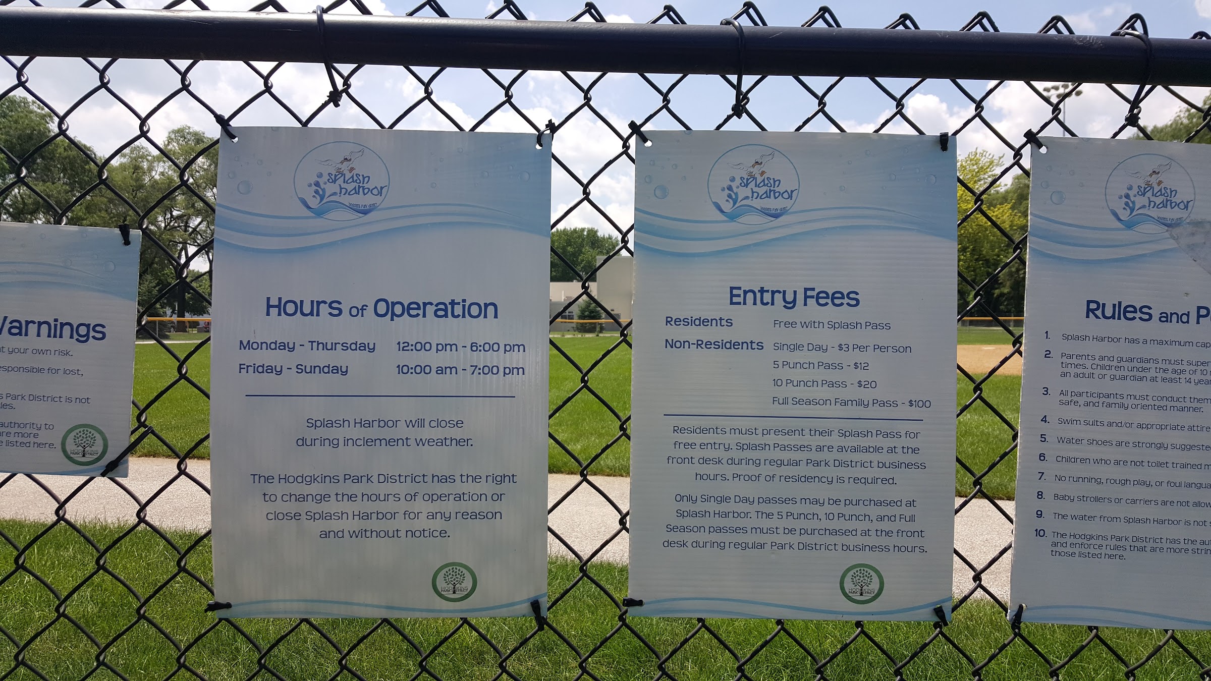 Monday- Thursday 12pm-6pm Friday-sunday 10am-7pm $3/kid A punch pass is 10 visits for $20. You can buy passes and punch passes at the gate. The attendant will have cash to give you change. The attendant can not take credit cards at the gate. Adults are free. Opening day is FREE. This year, it was Thursday, June 1st. Call ahead or check their Facebook page to see if it's closed due to repairs. There's a bathroom just outside the gate, the splash pad is enclosed. There's two picnic tables covered by an awning and plenty of reclining chairs for those who sun bathe.