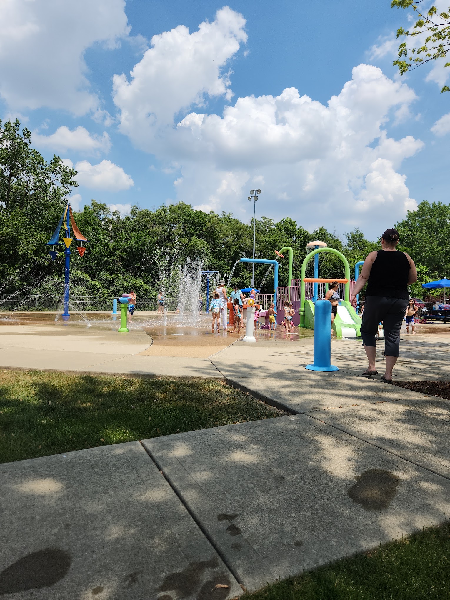 What are people saying (AI review summary)? This splash pad is highly recommended, especially for toddlers, due to its fully fenced and gated area, clean bathrooms nearby, and an adjacent park. Admission is $3 per child for non-residents, with adults free, and a punch pass for 10 visits is available for $20. Payment is cash-only at the gate, with an attendant providing change (no credit cards). Operating hours are Monday-Thursday from 12 PM to 6 PM, and Friday-Sunday from 10 AM to 7 PM. The splash pad features ample seating, including reclining chairs and picnic tables, with half of the area offering shade. A picnic area can be rented for parties. It's advisable to call ahead or check their Facebook page for potential closures due to repairs. The general sentiment is very positive, citing it as a great value and a perfect place to cool off.