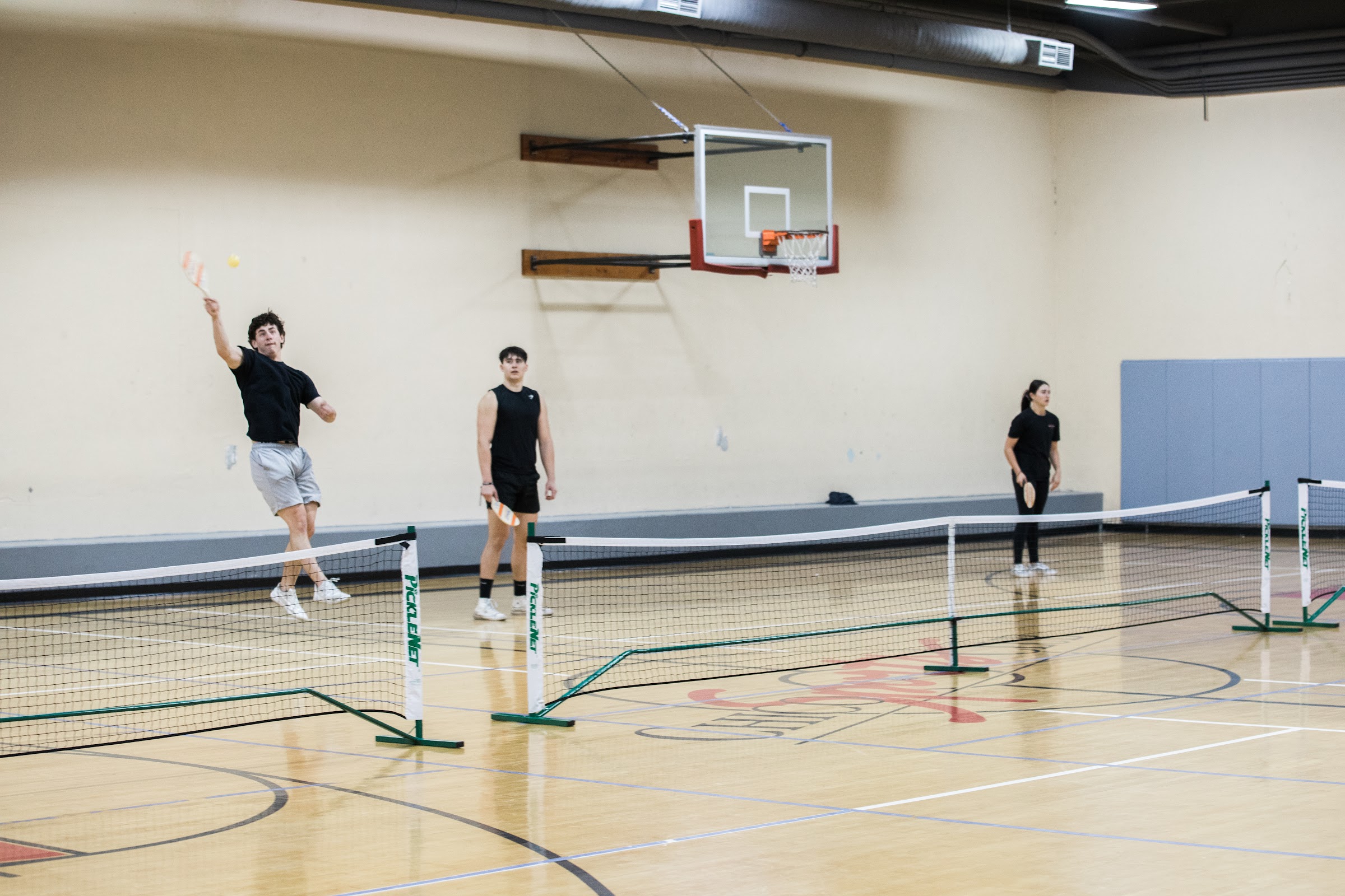Relaxed gym featuring weights, cardio equipment, a pool, basketball and racquetball courts.