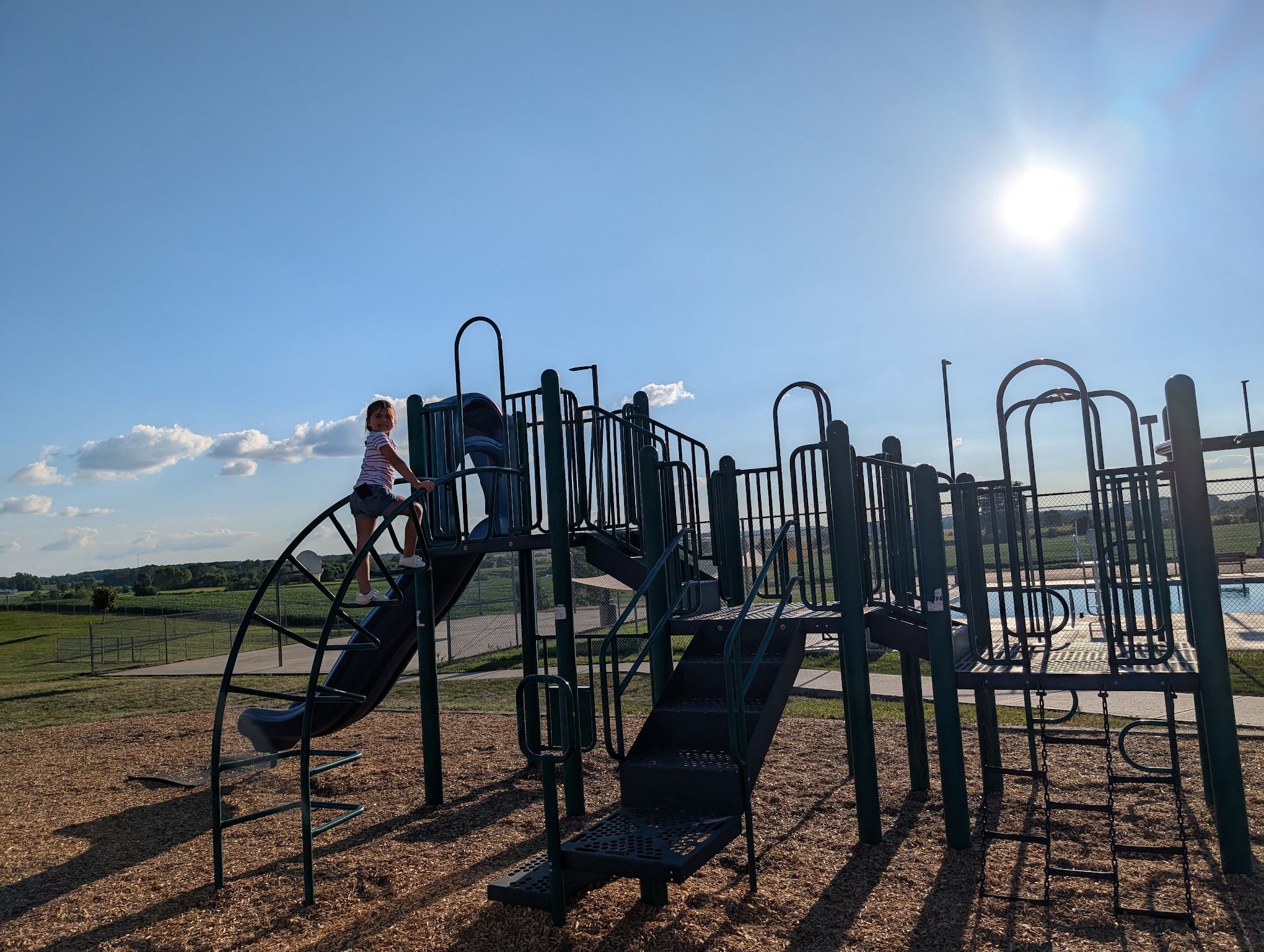 A small community pool with a separate splash pool for babies. Bring your own chair and keep an eye on your child. There are life guards on duty but while I was there a little one fell in and the life guard didn't notice until after a fully clothed parent jumped in to pull him out. Clean other than a giant mud puddle that had formed behind the diving board. No snack bar but plenty of vending machines. Temperature checks at the entrance. Finding the place was tricky and Google maps directed me to a dead end street and told me I had arrived at my destination.