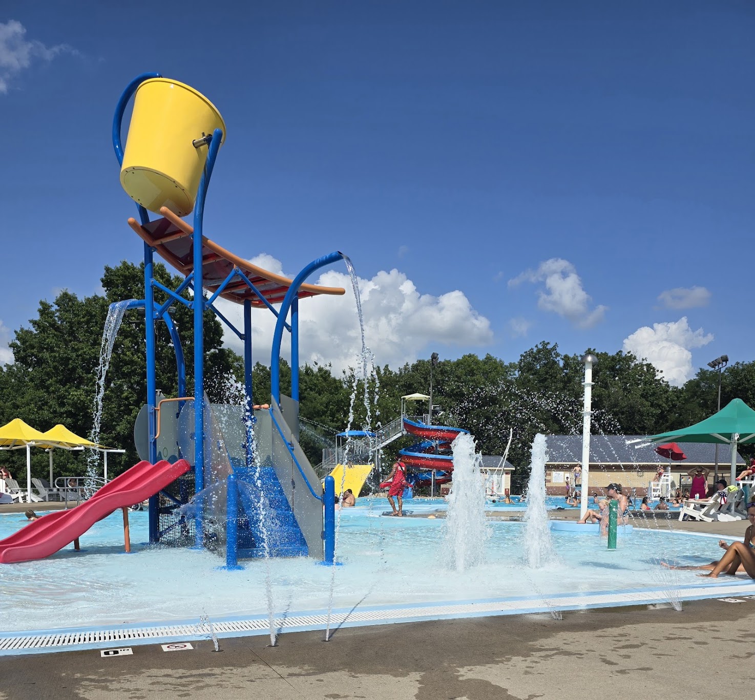 Summer pool with slides and a diving board, plus a kid-friendly section with a dump bucket.