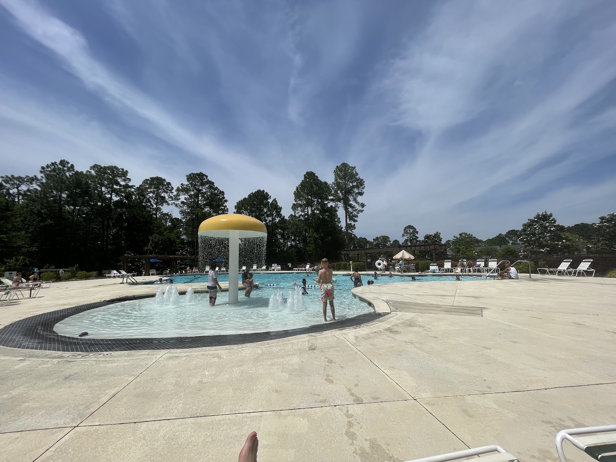 What are people saying (AI review summary)? This pool is generally well-regarded as a pleasant, family-friendly environment, particularly suitable for young children and families due to its shallow areas, water features (jets, mushroom), and rule enforcement that keeps older kids from being too rambunctious. Guests appreciate the ability to bring coolers and the presence of some shaded areas and umbrellas. However, there are significant concerns regarding upkeep and amenities; several reviews note a lack of sufficient chairs, tables, and umbrellas, worn and broken furniture, and pergolas in need of repair. Some feel the HOA's upkeep is lacking, making it feel subpar compared to other member pools, and there are reports of entrance guards allowing non-members in. It reaches a maximum depth of 5.5 feet, making it less ideal for teens. Despite these issues, it's considered a good spot for kids, grilling, fishing, and walks.