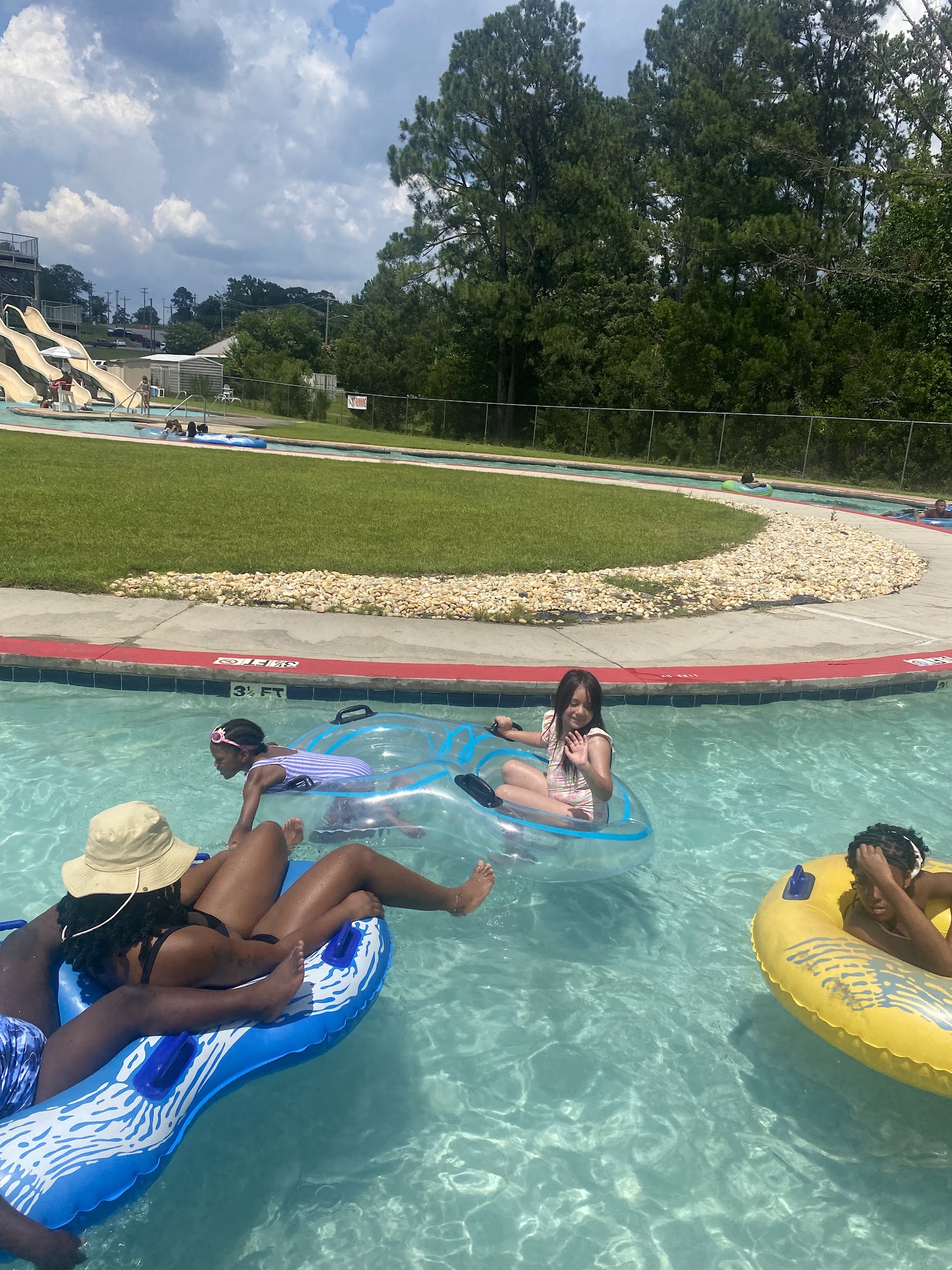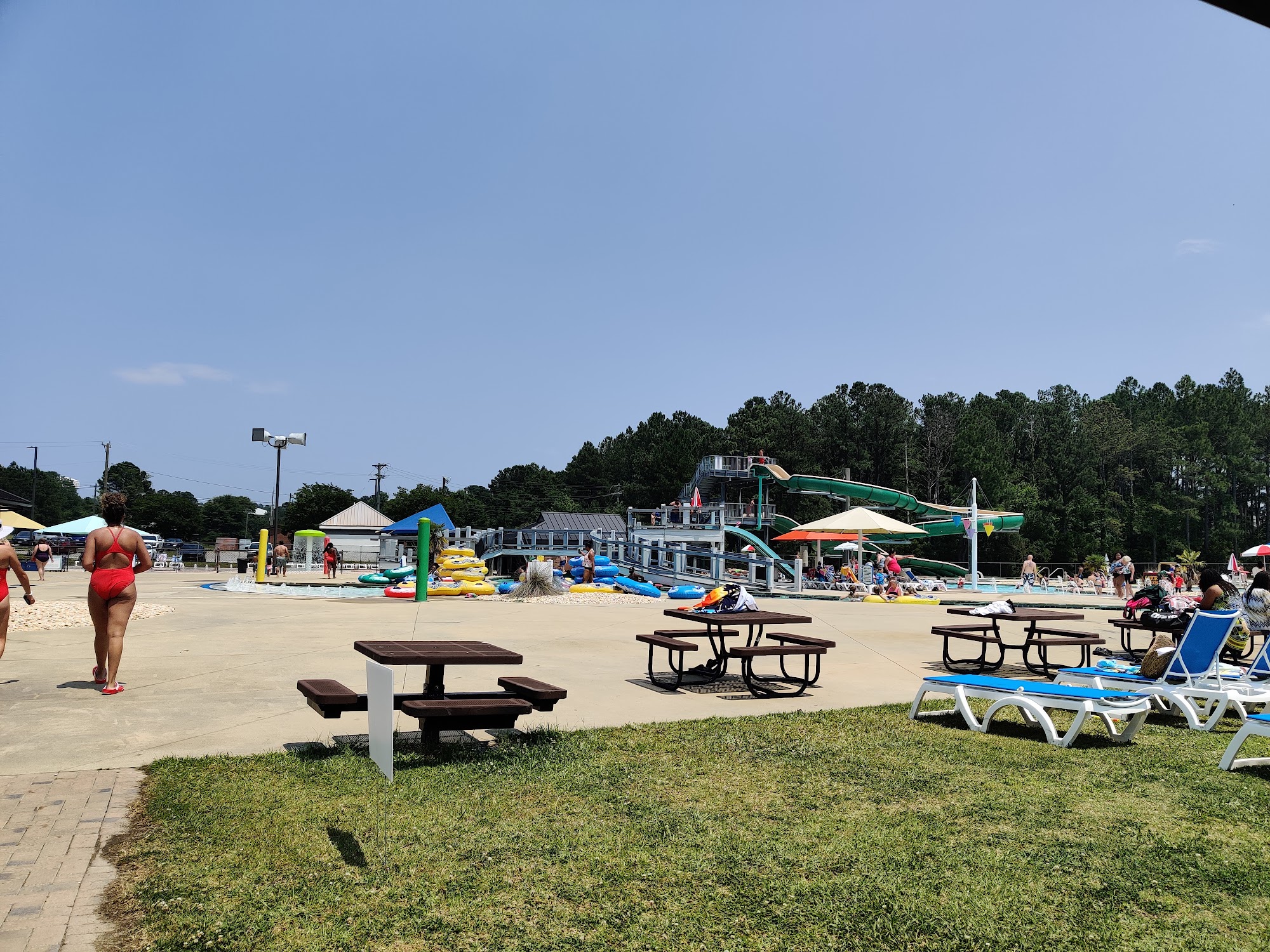 The lazy river goes around the whole park. Lots of chairs around to sit down. Multiple lifeguards around all the pool areas. Multiple slides to pick from. Snack bar available. Playground and shaded areas available. Big park enough for Multiple groups to have fun in the water. None of the water is above 5 feet so safe for all