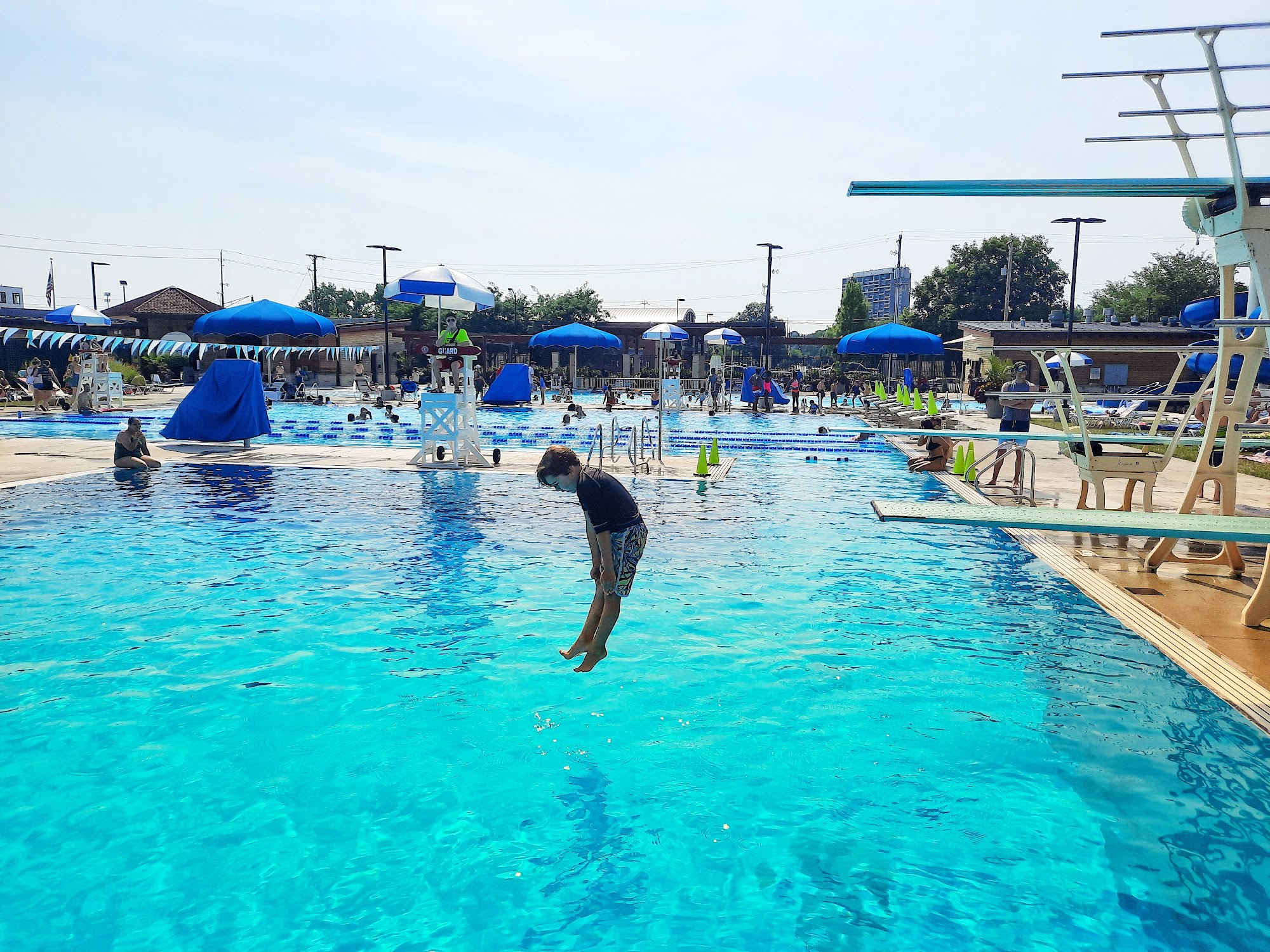 This is our second year to buy a membership here. Parking is pretty hard to come by unless you arrive before it opens at 11am. This pool is fun, extremely clean and offers a shallow “baby” pool, a kiddie pool, a double slide, a regular pool and 3 diving boards. They have 3 dedicated lanes for those who come to exercise/swim. The lifeguards do a good job and there are lots of chairs to sit in. The concession stand offers many snacks, food and beverages and the staff is great. Around noon, the daycare kids arrive and it gets a lot busier but they are chaperoned pretty well and behave. I’m going to be going back again today!!