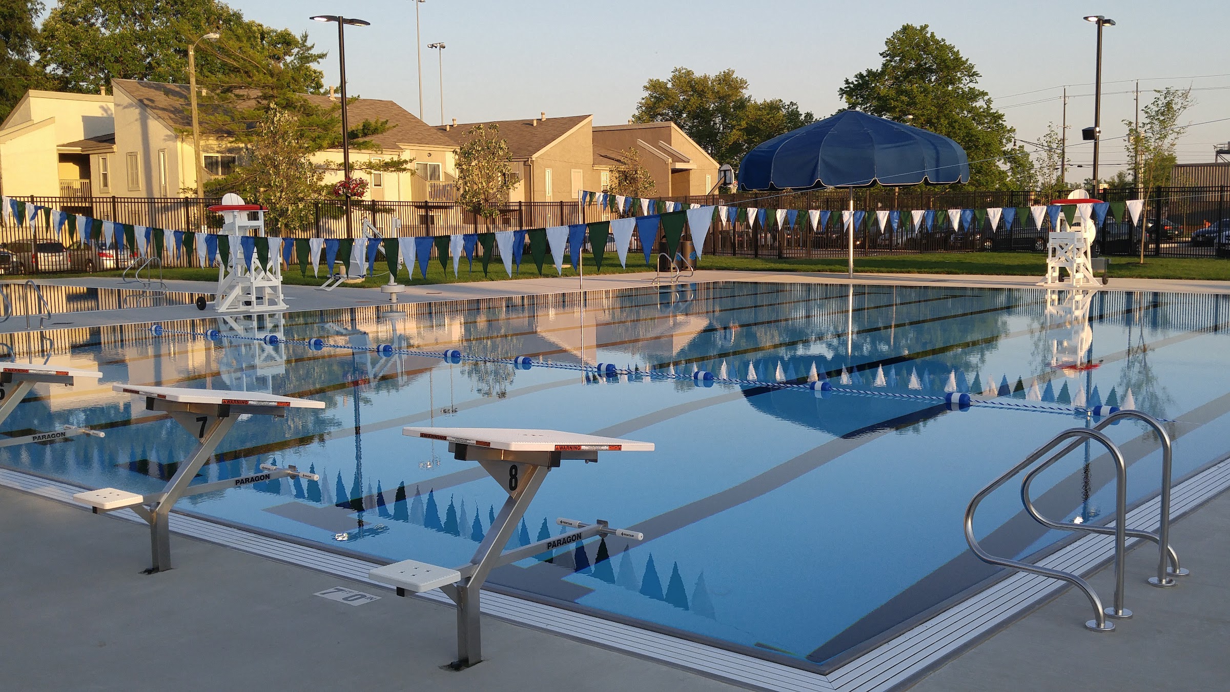 Community swimming pool with slides and diving boards, plus a family season pass option.
