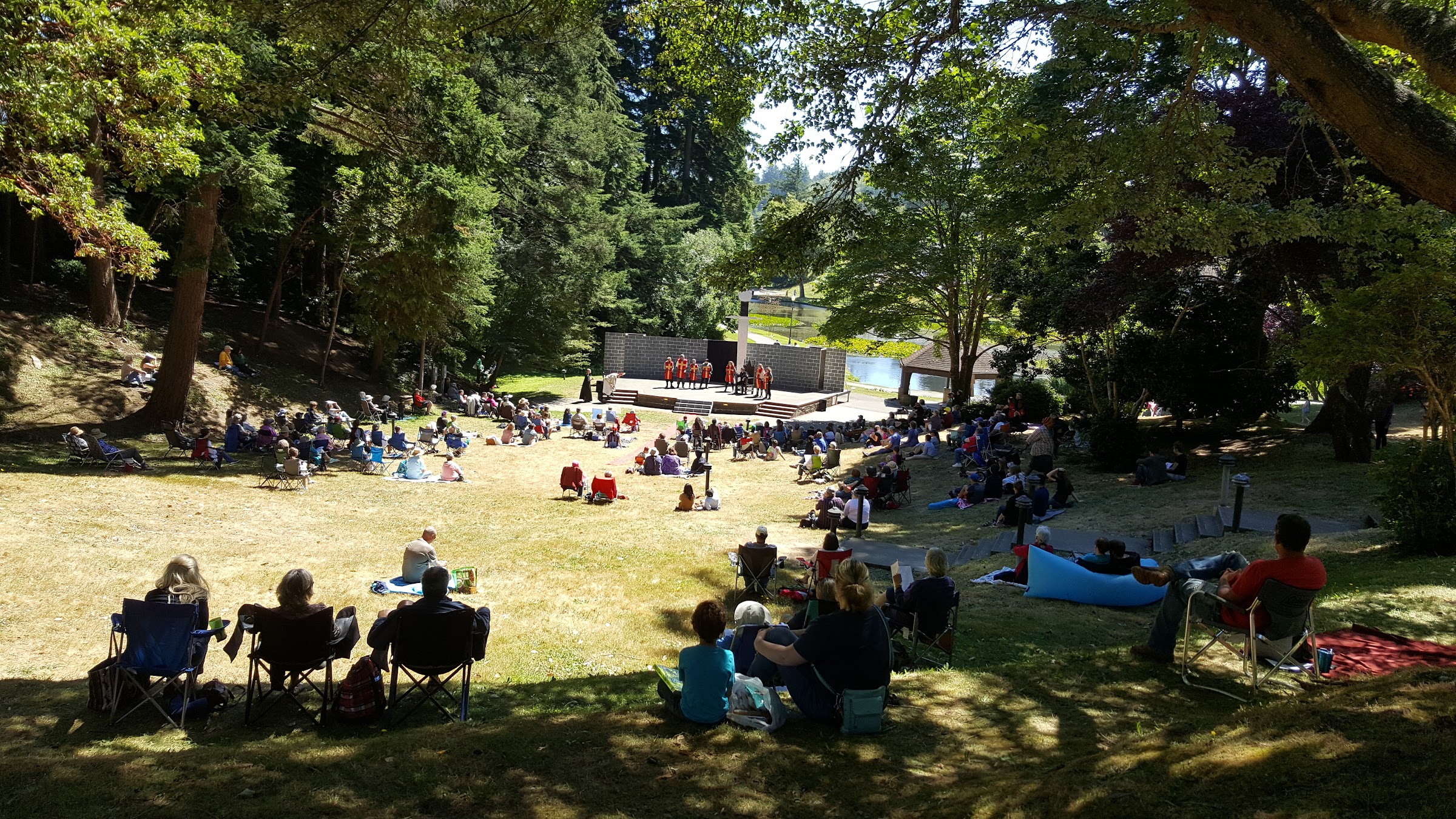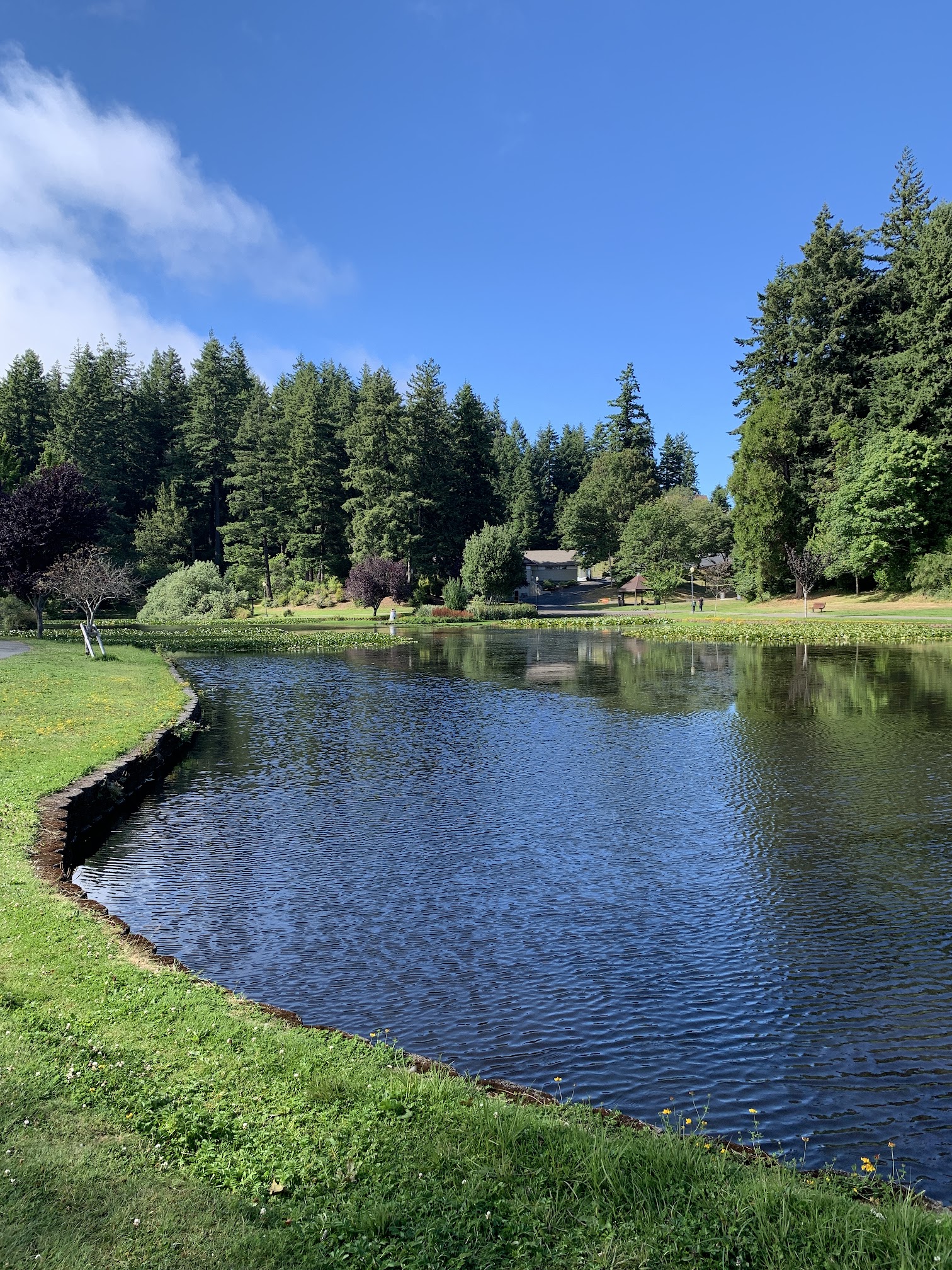 Very nice park. Lots to do and enjoy. Walking, hiking, frisbee golf, swings, slides, flowers, ponds, swimming pool, theater stage. The works