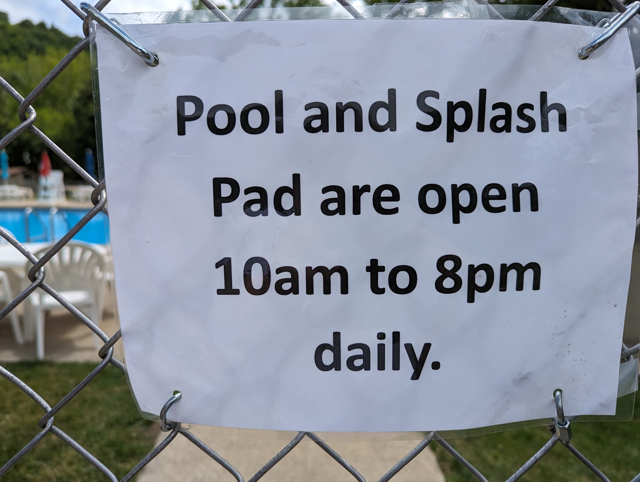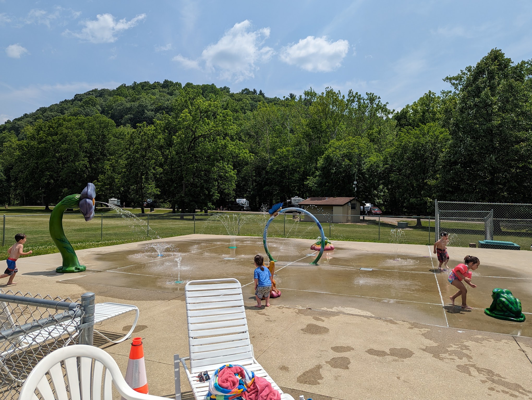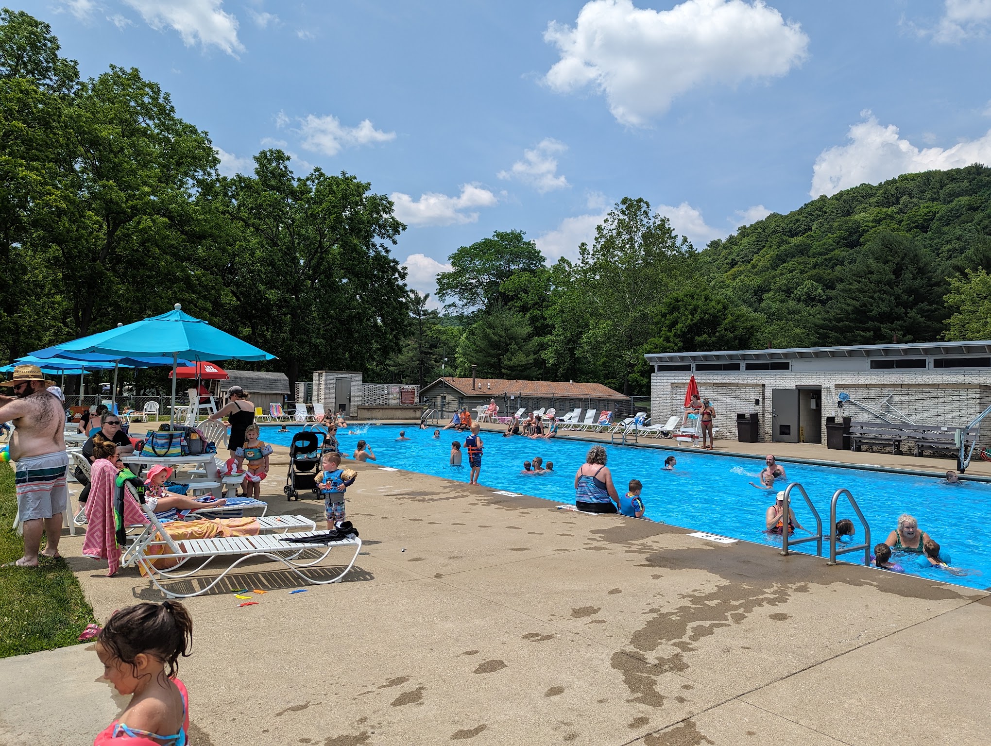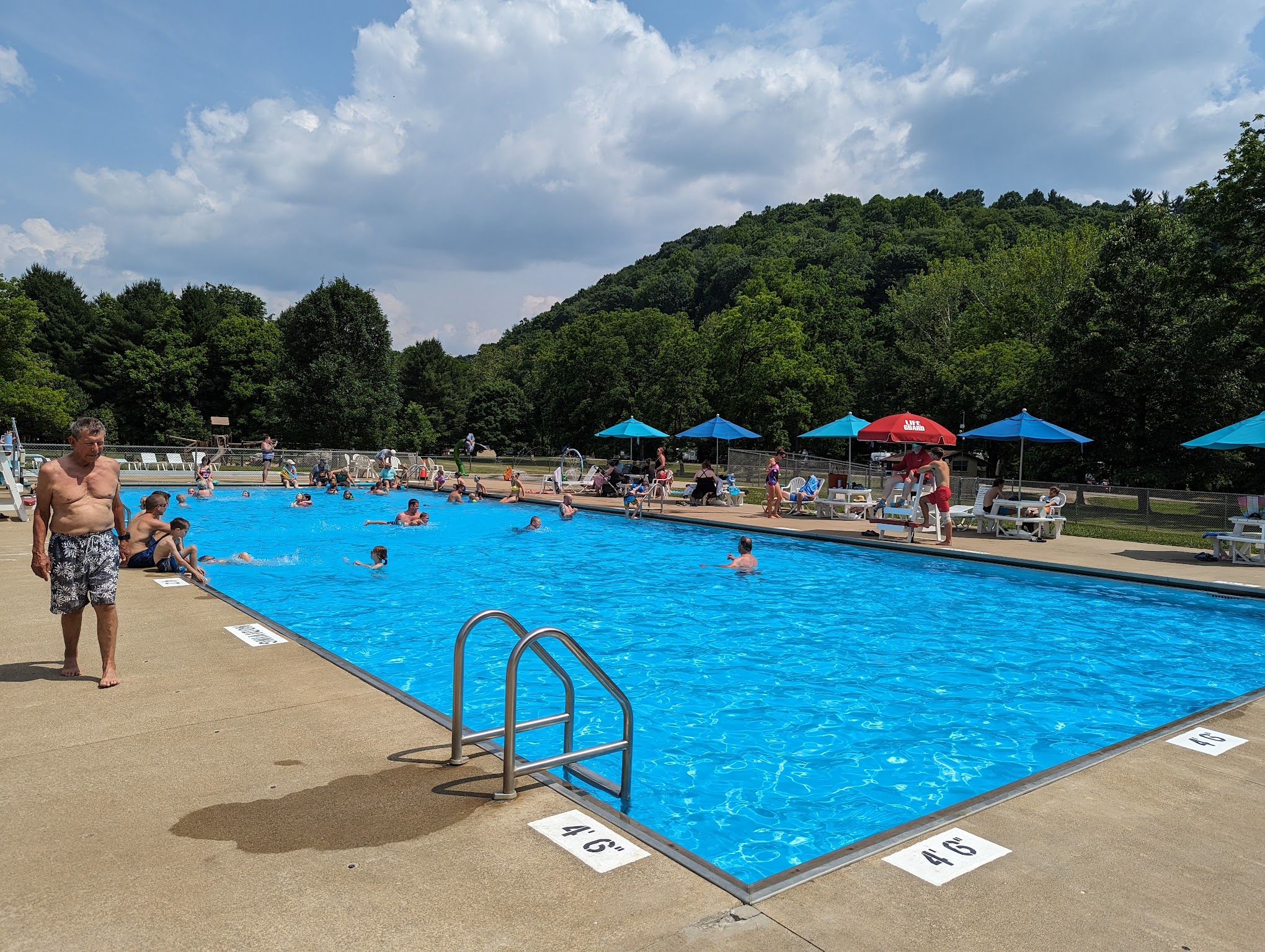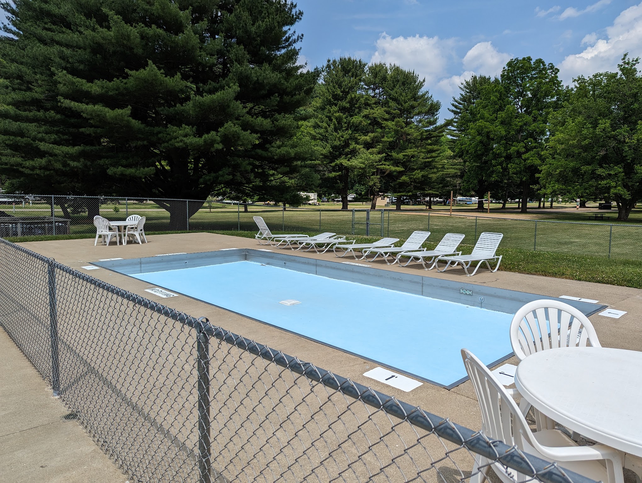 A nice swimming area for 4 and up. And a splash pad for the little ones. The facility is always clean. No slide or diving board but a great way to cool off. There is no commissary but its walking distance from the camp store where you can grab an ice cream before or after. They don't allow inner tubes or rafts but that makes swimming easier and honestly safer. Chairs go quick but there is a decent size area of lawn to sunbathe and some shade. Life guards are fairly laid back but keep a close eye on everyone. My kids always have fun.