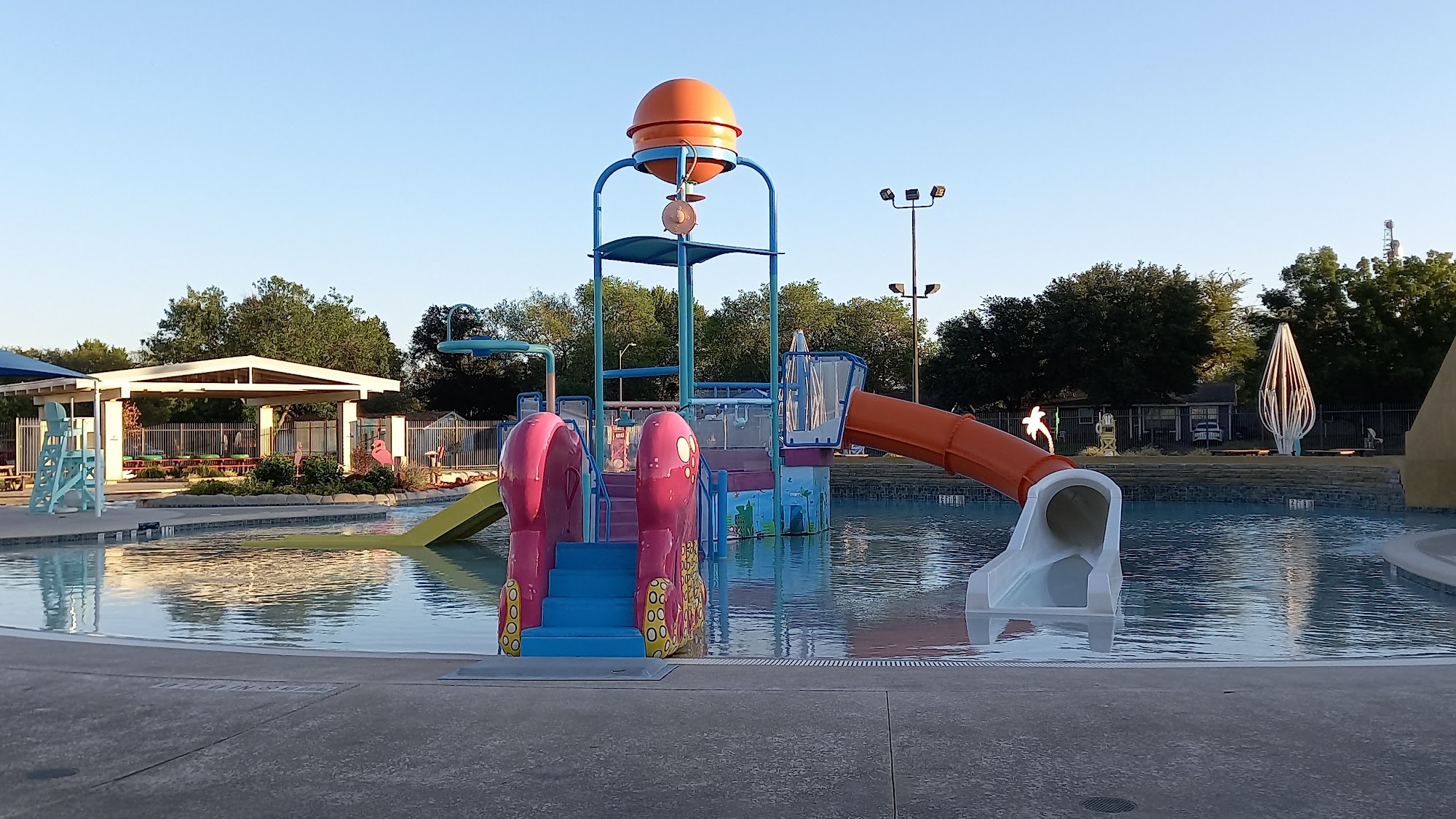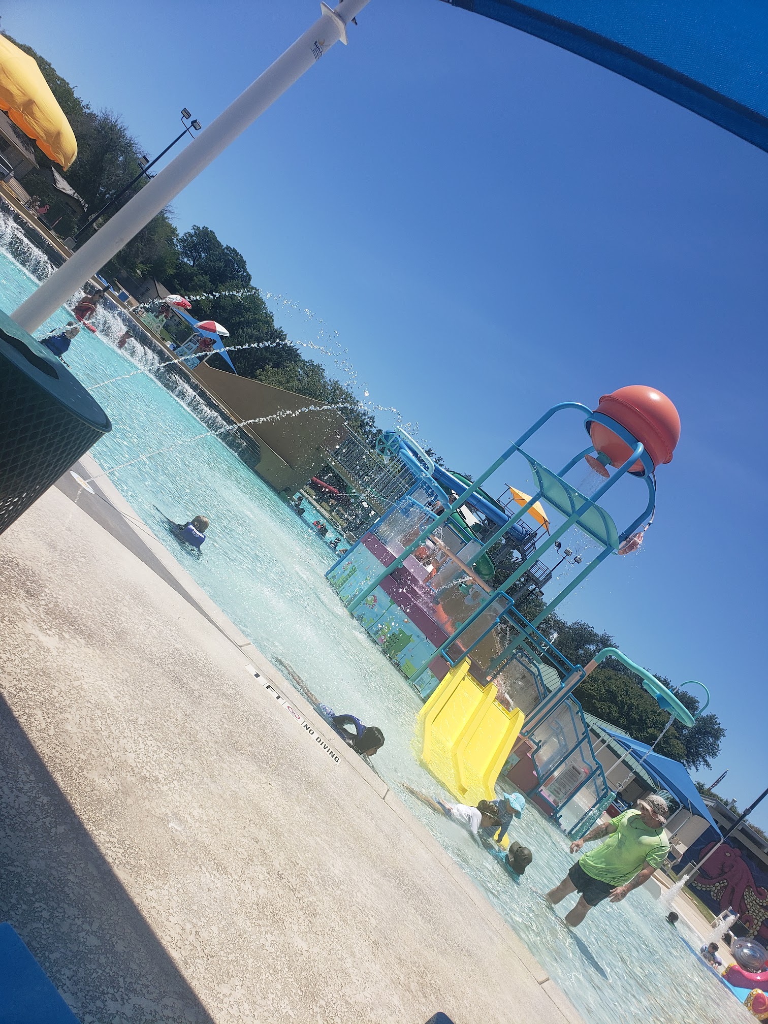 Amazing place to cool off and let the kids get some energy out during the summer. The pools are clean, large, and have a variety of depths. There’s a baby/little kid area with a water playground. There’s a pool that’s like a river rushing around in a circle. Super fun if you want to move around without much effort. There’s also a large pool to play around in. The water slides are fantastic. There’s an American Ninja Warrior type area for more challenging water fun. Life guards are everywhere making sure we stay safe. There are plenty of reclining seats in sun and shade, whichever you prefer. Picnic tables are scattered throughout if you’d like to eat. There is a concession stand I didn’t try out, but it appeared to be a popular spot. The prices for the aquatic center are quite low. Much lower than anticipated for a place this nice. Good job, Euless! Highly recommend!