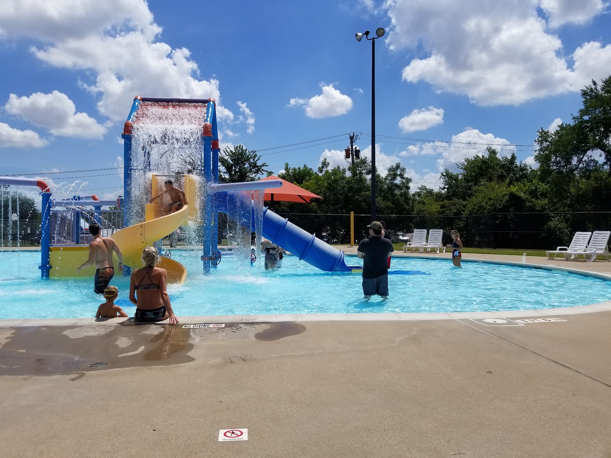 Leisurely water park featuring a pool with slides and a splash pad for toddlers.